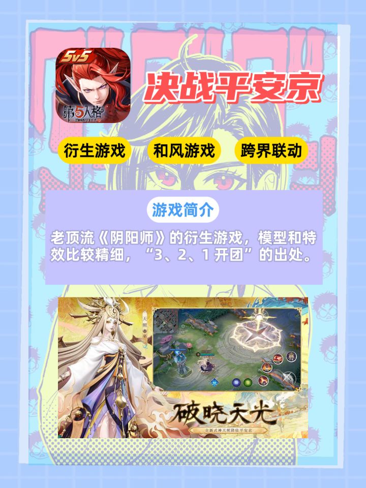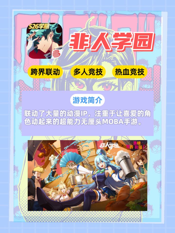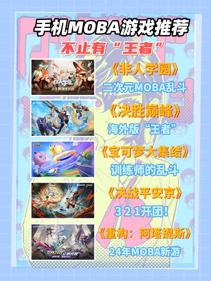 🎉非人学院🎉:与大量动漫📺IP联动的MOBA🎮游戏,喜欢二次元👾大乱斗的可以玩👍,有自己喜欢IP💖的无脑玩😎!🏆决胜巅峰🏆:海外🌍地位相当于国内“王者”👑,国服🇨🇳尚未开启,据说👀会有“全英雄全皮肤免费🎁”!🐉宝可梦大集结🐉:鹅厂🐧开发的宝可梦🐥乱斗MOBA手游📱,降低⬇️了竞技性,娱乐性🎉很高,不是宝可梦粉丝🙅♂️也可以尝试👉。🌸决战平安京🌸:老顶流🌟《阴阳师》的衍生🌱MOBA游