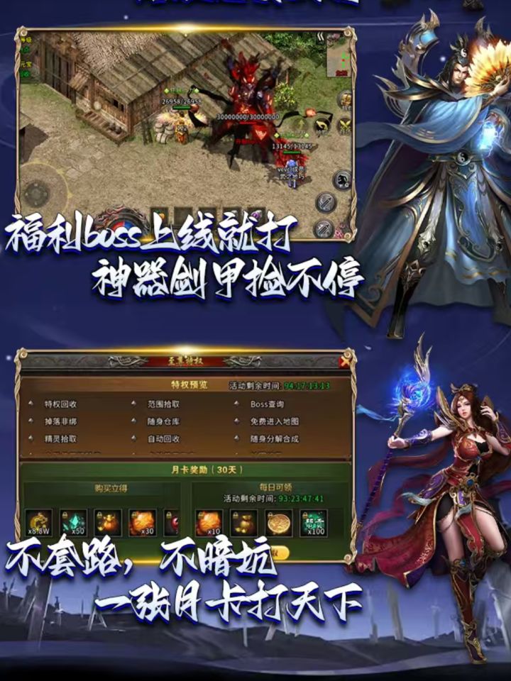 冰雪传奇手游【龙城秘境-重返冰雪2019】经典单职业战士服,【新区有活动!详情看图三】怀旧爆率拉满,纯靠打怪,装备全靠打,公平无套路,老玩家们快来体检吧~全服无限悬赏回收,一转装备起就能参与,装备保值无忧,材料全靠打怪掉落,首饰3合1、武器10合1,等级越高福利越丰富,斗笠、盾牌、宝珠特殊装备,品级越高属性越强,战力稳步提升。沙巴克城战焕新,获胜方限时城主称号+专属时装+成员称号,全阵营7天属
