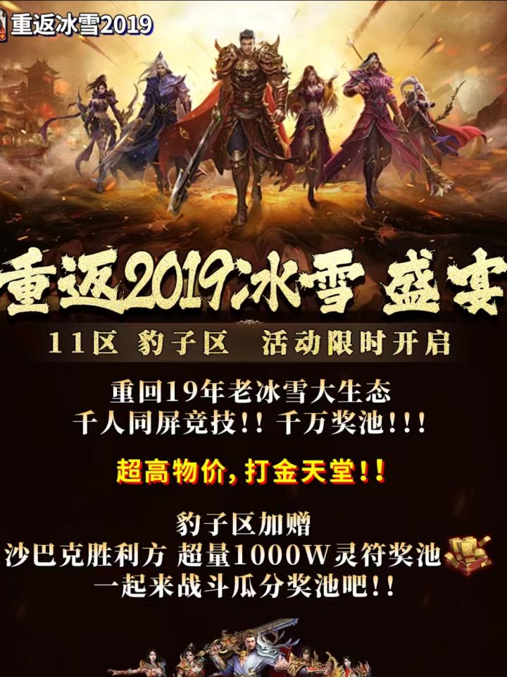 重回19年老冰雪大生态千人同屏竞技!! 千万奖池!!!超高物价,打金天堂!!豹子区加赠沙巴克胜利方 超量1000W灵符奖池一起来战斗瓜分奖池吧!!#冰雪传奇 #冰雪传奇打金 #重返冰雪2019 #冰雪传奇搬砖打金 #冰雪传奇点卡版
