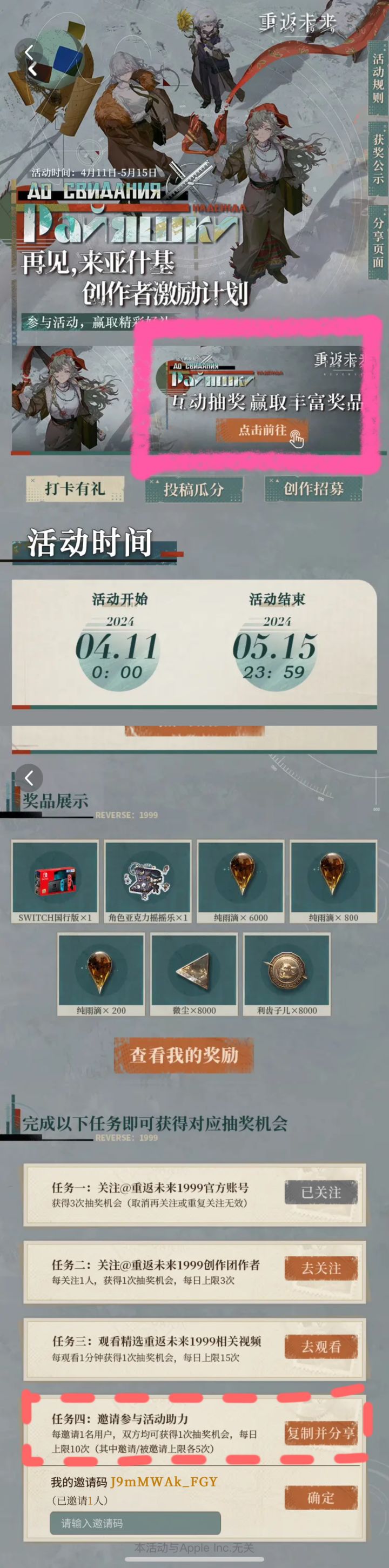 1.8版本【再见!来亚什基】征集活动现已开启!#重返未来再见来亚什基征集活动 正式开幕!【活动时间】投稿时间:2024年4月11日-2024年5月15日评选时间:2024年5月16日-2024年5月30日结果公布:2024年5月31日前【征集内容】-攻略考据赛道- 围绕《重返未来:1999》1.8版本内容以图文、视频等形式创作发布相关通关攻略、角色评测、剧情考据、配队分析、资源盘点等