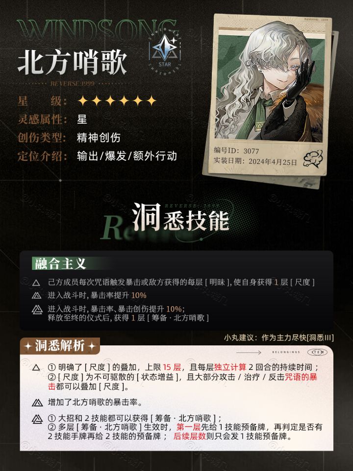Tada~这里是小丸!本期带来的是【重返未来1999】V1.8下半卡池的新角色~角色:北方哨歌 | Windsong星级:❇️❇️❇️❇️❇️❇️灵感:星创伤:精神创伤定位:输出/爆发/额外行动1⃣️角色定位2⃣️洞悉材料3⃣️心相推荐4⃣️技能解析5⃣️尤提姆6⃣️共鸣推荐7⃣️抽取建议8⃣️配队思路9⃣️塑造建议等角度全面给出参考建议💬——————————————————