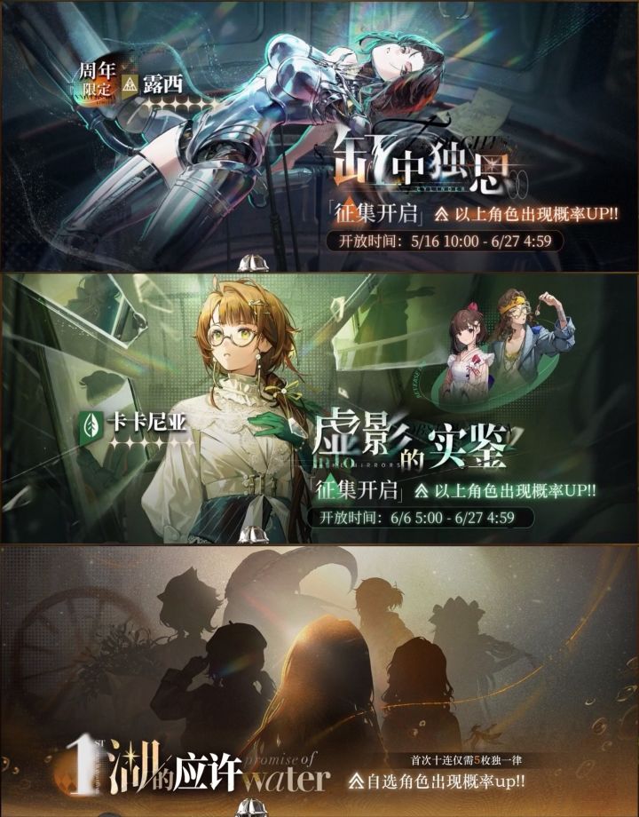 【兑换码:截至5/10 24:00】兑换码1:露西老板好兑换码2:医生医生兑换码3:516171999(直播事故我直接爆笑)———————【版本角色、卡池】1. 限定角色:露西限定卡池:5/16 10:00-6/27 4:592. 新六星角色:卡卡尼亚活动卡池:6/6 5:00-6/27 4:593. 新六星角色:塞梅尔维斯(登录赠送,1.9版本进入常驻)4. “湖的应许”