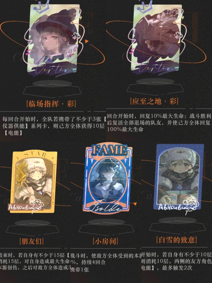 这套卡成本很低,两个闪一个橙,比37逃课更便宜,而且还不需要你去借助战,奶妈大家自己肯定都有。开局打完第一区域,把奖励先领了,解锁uttu零售后先把十次刷满,然后开卡合卡,基本就能凑够了。用过的都说好!对角色基本没有任何要求,只需要把你箱子里的奶妈带上就行了。 出牌思路:根本不需要出牌,移卡消耗行动点就行了,可以根据情况偶尔出两张奶卡。所以你完全可以开自动挂机! 【名人卡】 一号位: