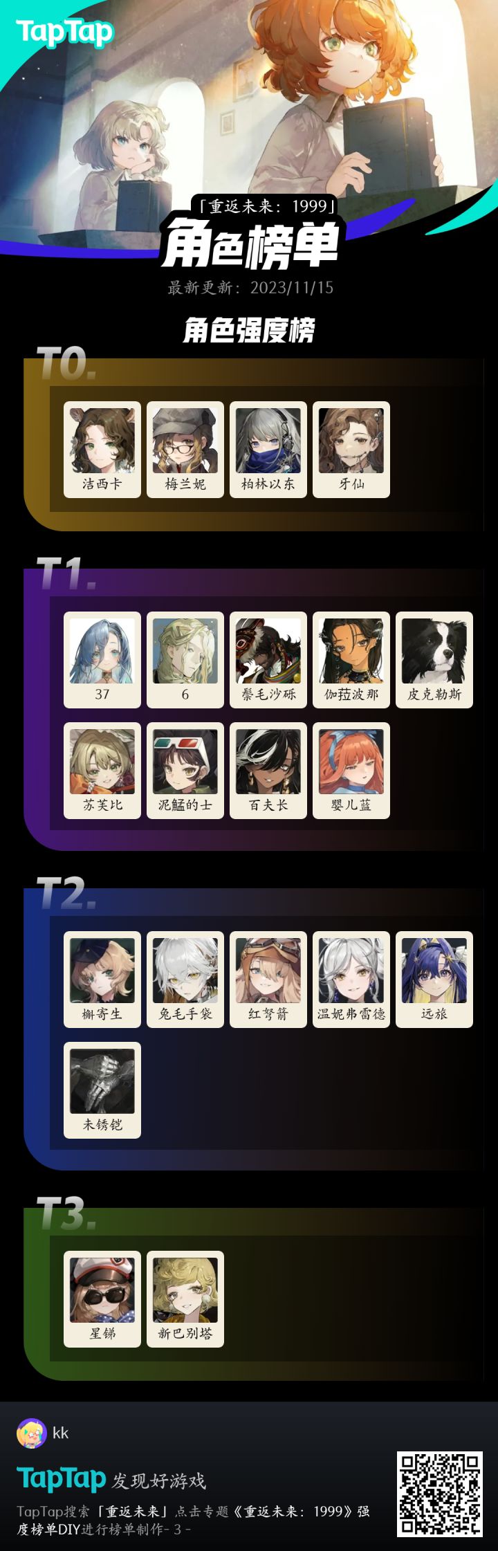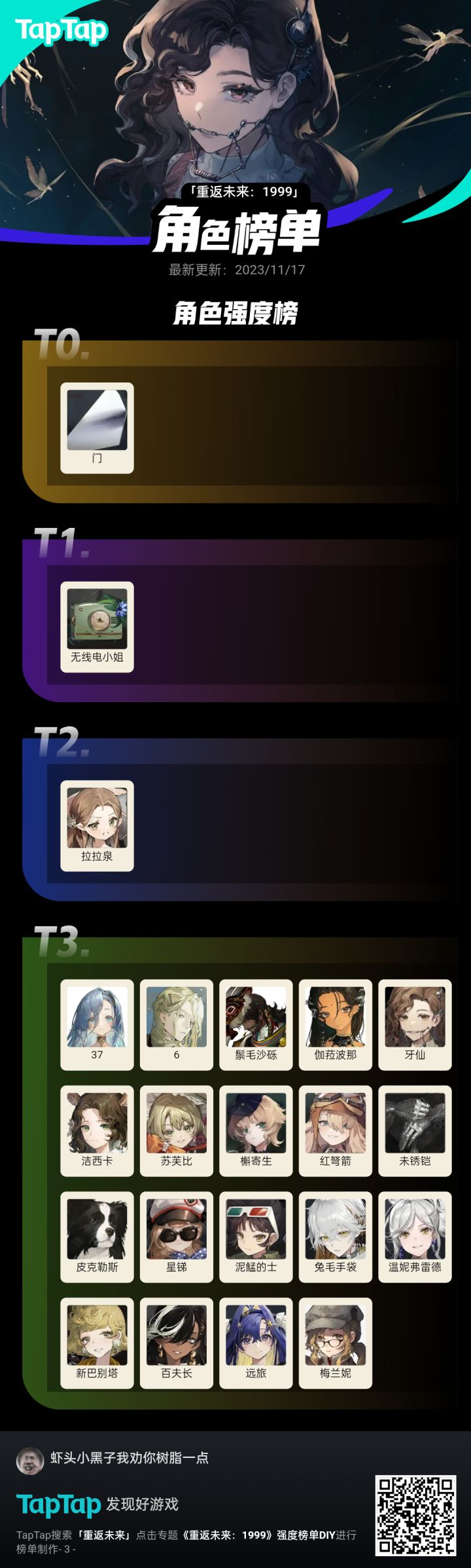 t0:超模t1:强度较高。主c再强也只能进t1,铠子t1守门员t2:强度正常温妮配对t2,单通t0t3:未来可期贴个练度防云#重返未来:1999强度图#噗噜噜实验室