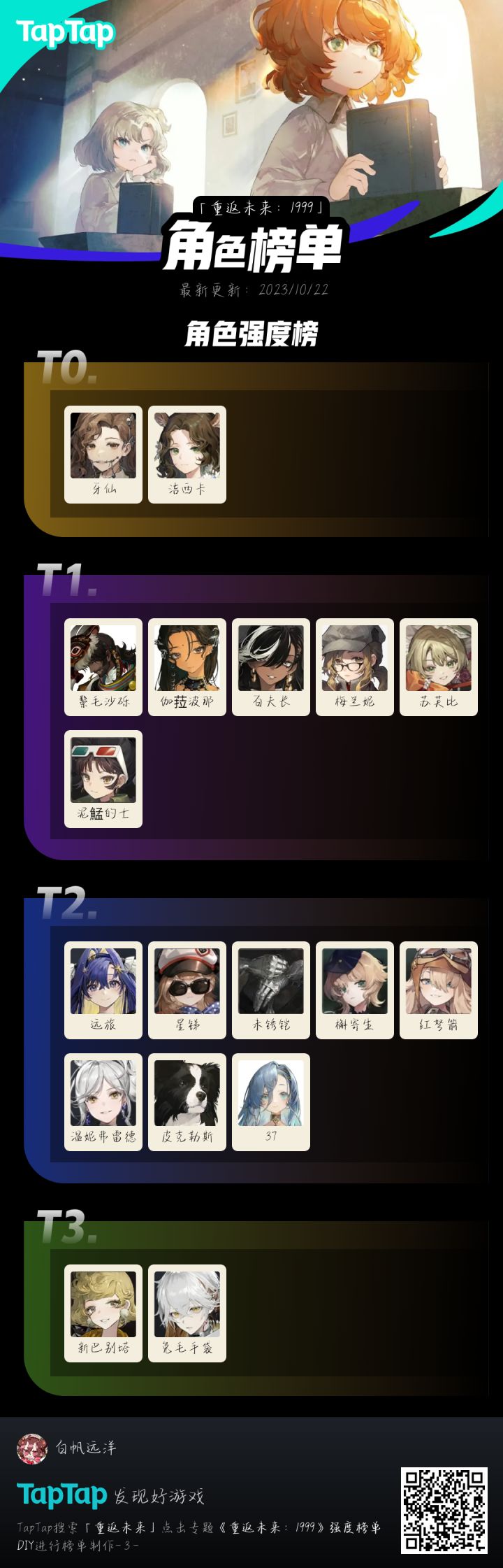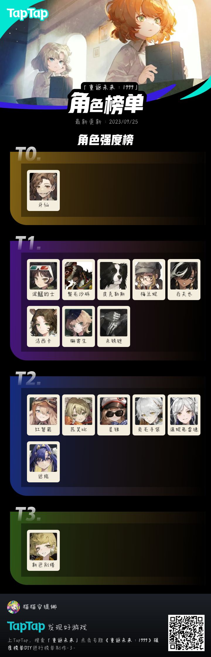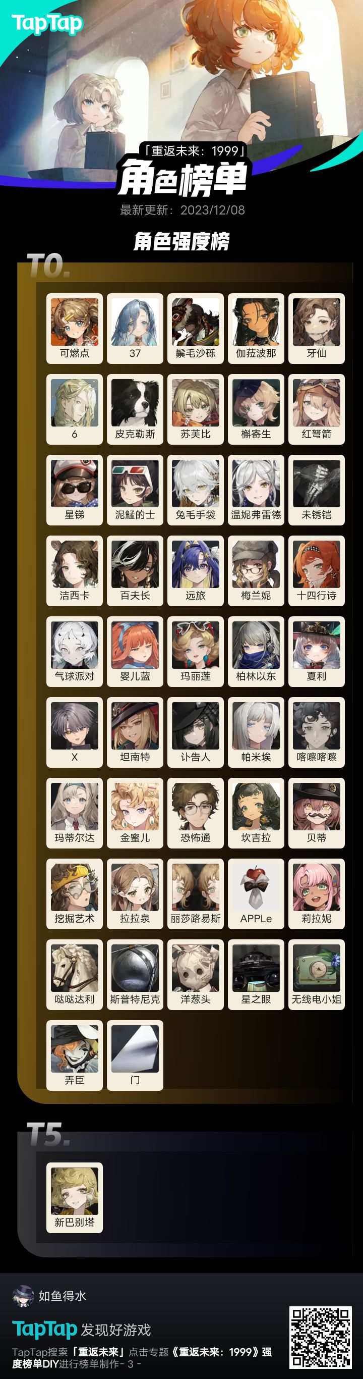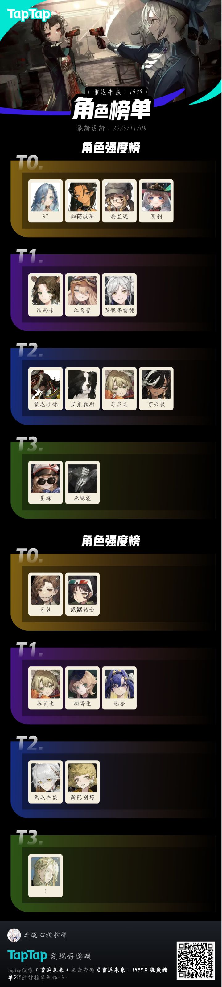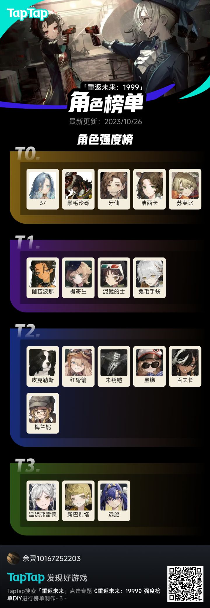 要是出个T0.5就好了,个人认为梅兰妮要比T1高的,但是0塑梅兰妮好像也没那么超标,所以就排在T1啦,牙仙T0我想大部分人都认同,毋庸置疑的强,基本上什么队伍都可以塞个牙仙,小鹿零塑逆属性战神,满配夜色直接起飞,剩下的可能就未绣铠和斛寄生有点难排,感觉他俩都属于没有强到T1,但又不弱的感觉所以就排到T2了(厨力党勿喷)其他的我觉得就没什么了,大家看个乐子就行了#重返未来:1999强度图