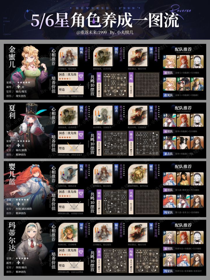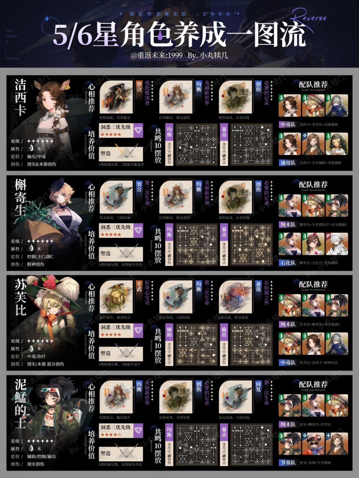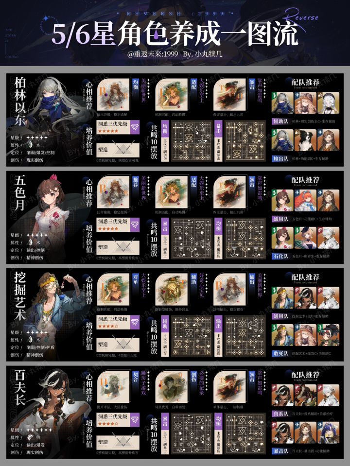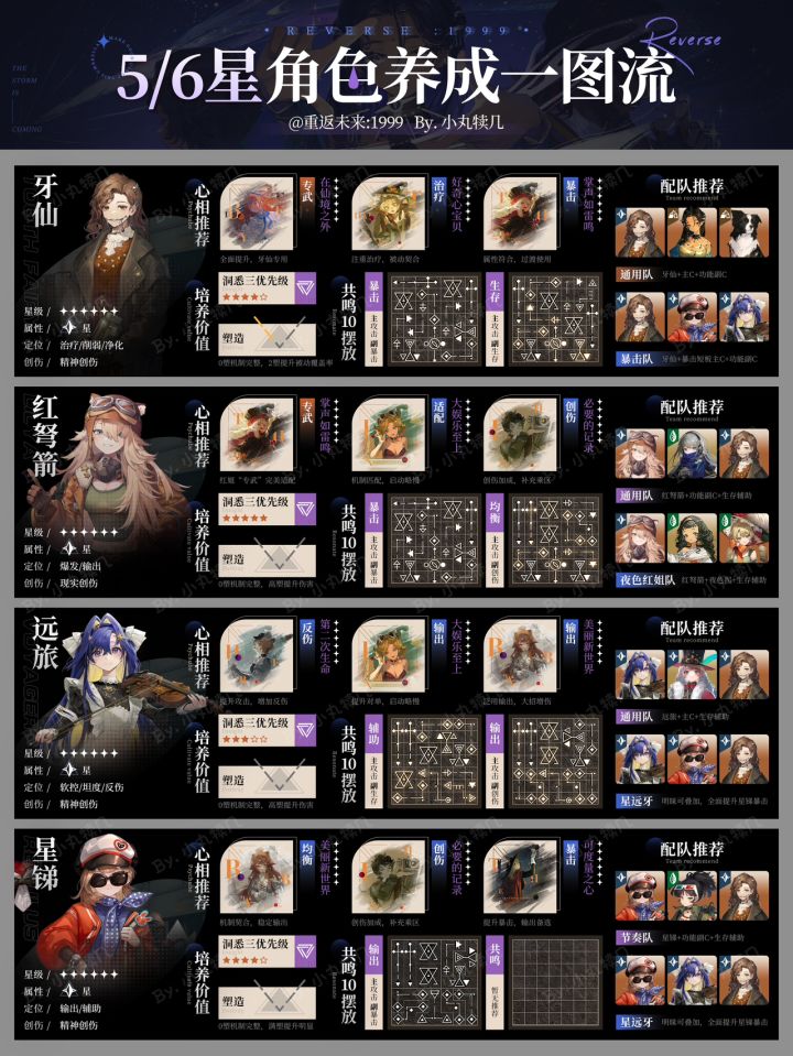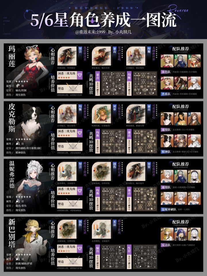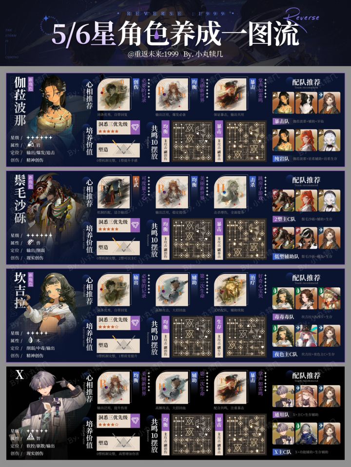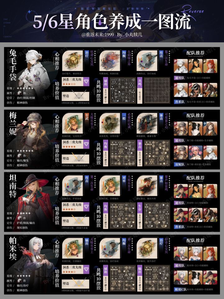 V1.3更新|重返未来1999『5/6星全角色一图流』养成攻略将将,这里是小丸~本期给大家带来了船新版本,优化后的全角色一图流攻略<重返未来1999 V1.3版本行至摩卢旁卡>『5/6星全角色一图流』养成攻略——————————————————一图流V1.3.2版本『更新内容』:【角色部分】1.新增V1.3新角色:鬃毛沙砾/坎吉拉/伽菈波那。【心相部分】1.更加清晰地注明定位:输出/