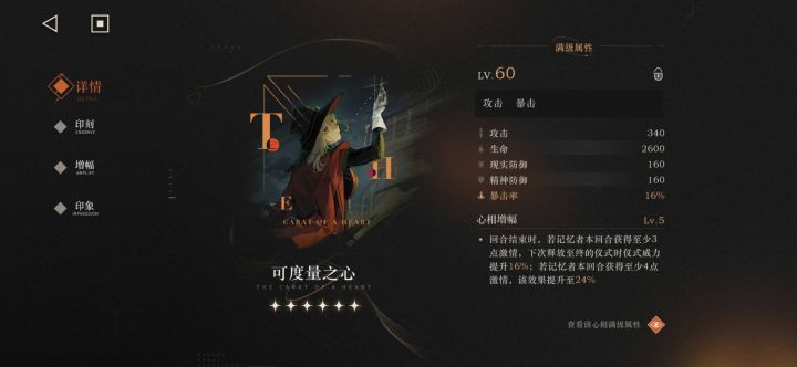 仅仅提供游戏思路关于星锑厨首先说掌声并不适配星锑,星锑只有一个单体技能吃不到全面的掌声增幅。但是可度量之心是单回合获得激情点提高下次伤害开局刷三个星锑的技能(尽量是两个单体)一动两释放,四点激情,正好吃满。(大大关卡)有躁动的心后,就更容易吃满,即使吃不满也要比单一的单体爆伤加成划算。甚至白值还高了10点。不过这样星锑就有的主c的味了。单回合要吃很多行动点,双回合动一下刷大也可以,