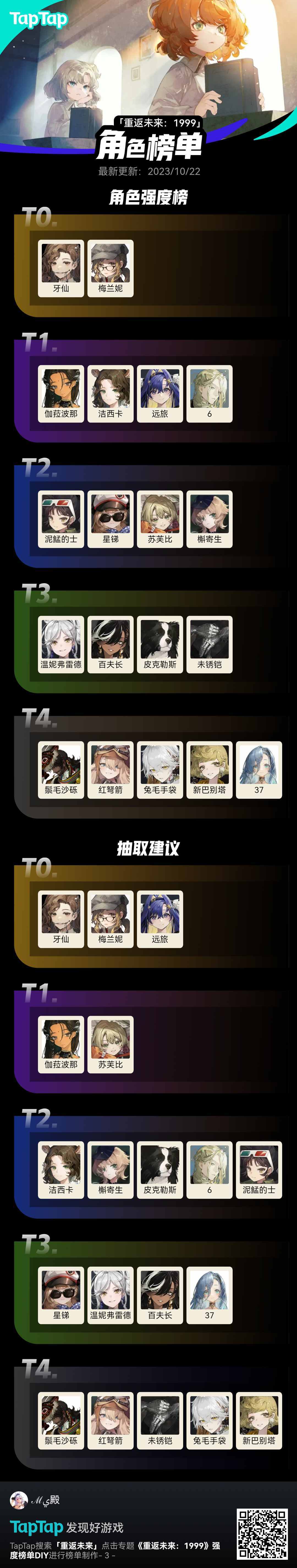 抛开配队说强度一律按耍流氓,本图文仅展示角色单体定位(输出向/辅助向)强度榜单。这里就简单说一下部分,1.夏利(满塑),t0,虽然是一个五星角色,依然归到六星里面,强度顶破天,在深眠跟utto怪怼buff怼一群的情况下,夏利自身大招高倍率跟驱散增益实在好用不过(点名X),无论是对单还是清渣表现都十分良好。2.红弩箭,t0.1,把他归到t1单纯是因为大环境,在无塑造的情况下,弩箭的单体输出已经