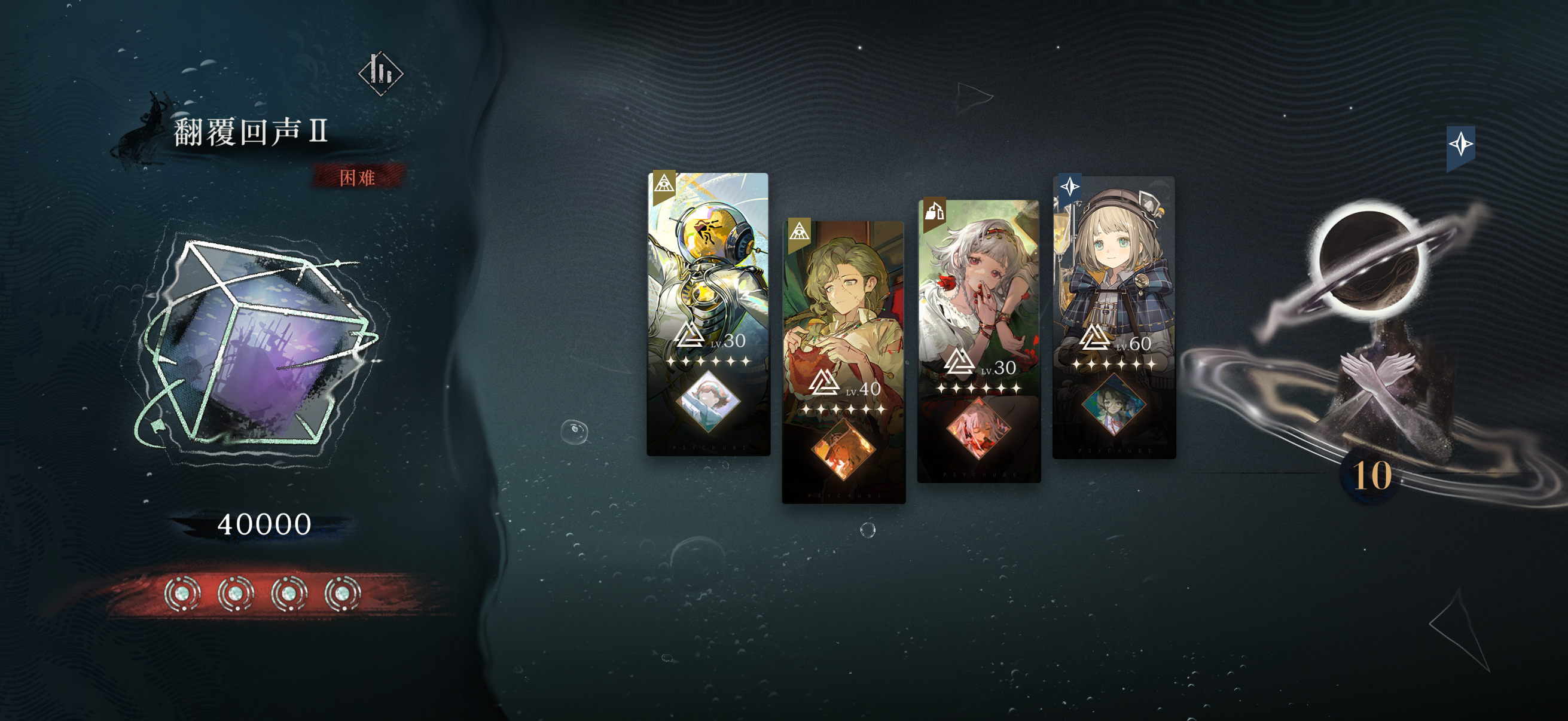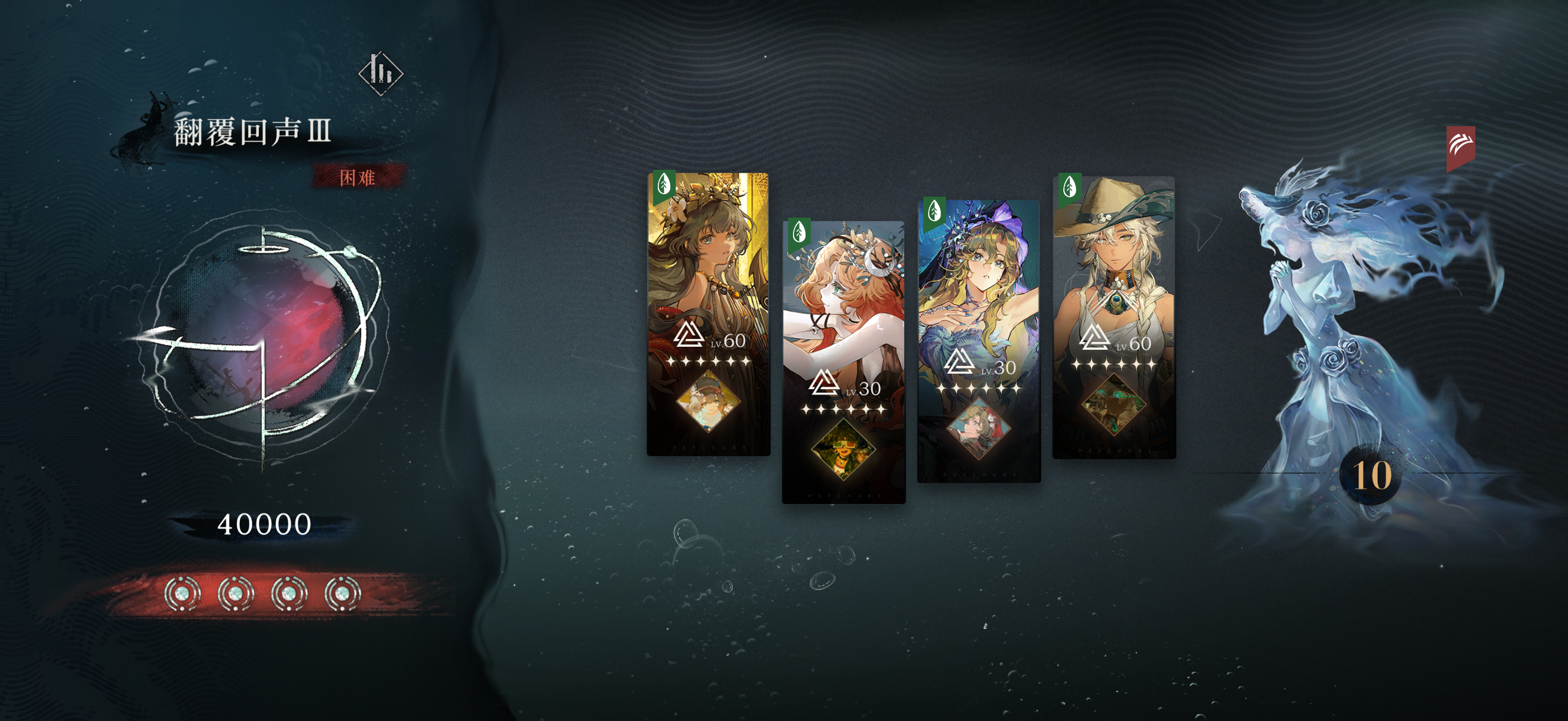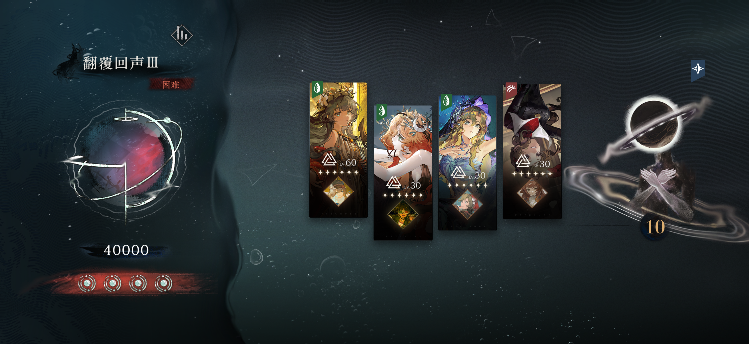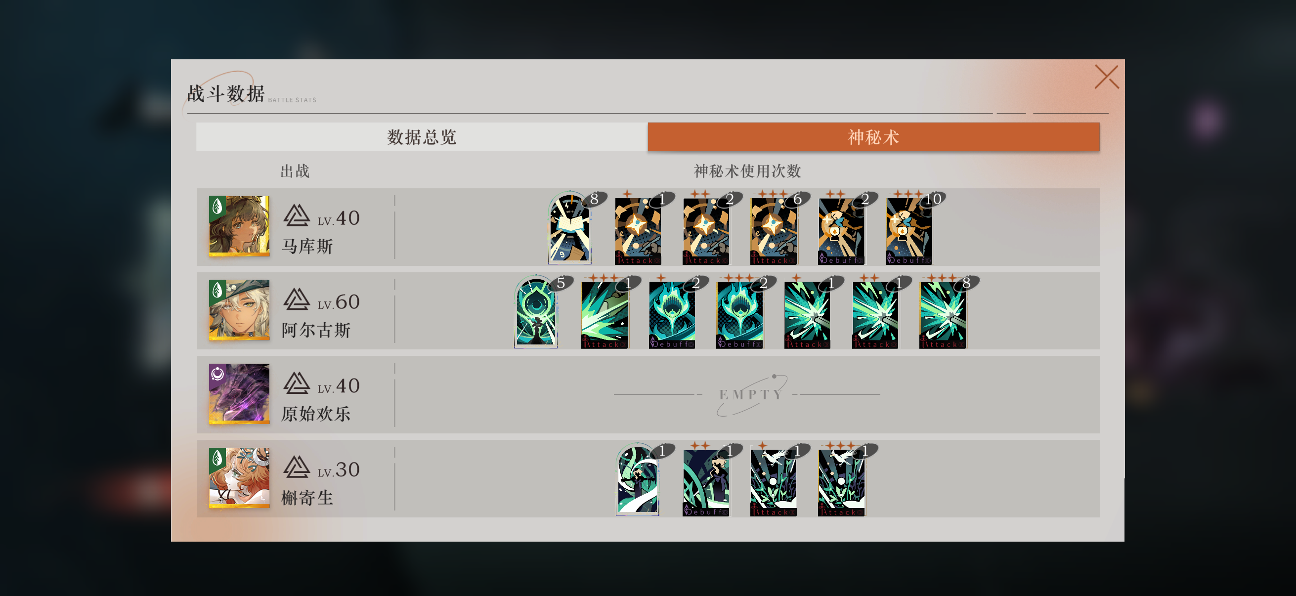 回声- I:苏+骨+帕组毒队。应该再带个槲寄生之类的加输出的,这里愣了忘记苏神能奶就顺手带了维拉想搞纯木队,但是蓝手帕就不是个木啊!捂脸哭一直不回玩毒队11回合将将卡过回声-II:红+37+牙+卡。本来是想组纯星队(爱滋拉换卡卡),但是一看有按次数打的怪,那就是卡神专场啊,带本源伤害的技能算2点,且卡卡被动全场都有伤害,真是不得不带了流口水轻轻松松红姐卡神带过。回
