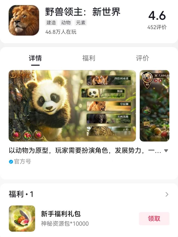 新游首发!这款游戏不仅有建模十分逼真的上百种动物!还可以体验非常刺激的野外生存玩法! 『登录就送纯野生大熊猫』#野兽领主新世界