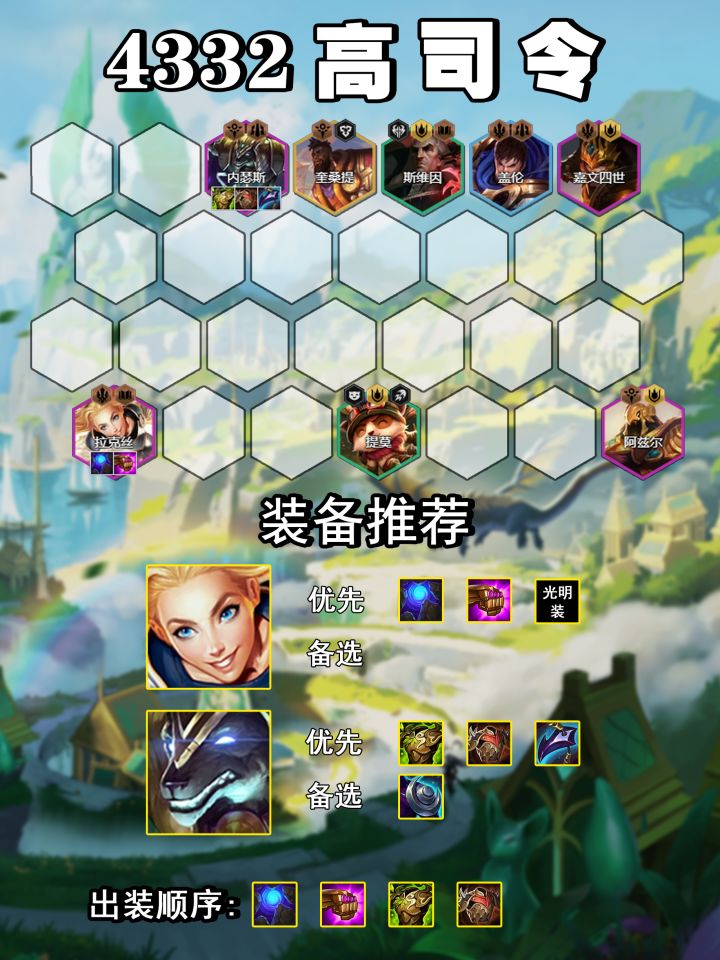 赛季末了,你们还不知道用什么阵容就用这个4332高司令,百分百上宗师,没问题的。真的超级强,用了才知道。去吧去试一试吧,记得来交作业就好了⭐️英雄之力:德莱文⭐️符文强化:2-1战争财宝能得英雄复制(给拉克丝、沙皇、狗头用),3-2、4-2无脑选德莱文的符文。⭐️运营思路:【2-1】拉4人口,用3恕瑞玛2格斗,尽量走连胜【2-5】 拉5人口上提莫开2术士,装备尽量用上,打连胜!【3-