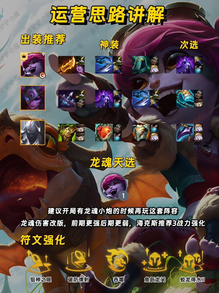 龙魂小炮成型简单伤害超高💣只需要三星小炮就能一路升级💹完全没有任何运营难度✨过渡思路✨建议开局在有龙魂小炮天选再玩🐉海克斯直接选择3战力强化💪前期开3龙魂2神射不升级走连败❌选秀优先做小炮装备🎉野怪后直接梭哈搜出三星小炮⭐然后在每次升完级后有20金币就可直接升前中期能很好的压制对手🏹后期需要三星希维尔、二星莎弥拉补输出有机会上九优先补前排🛡️猪妹、慎、瑟提、永恩、奥恩等都