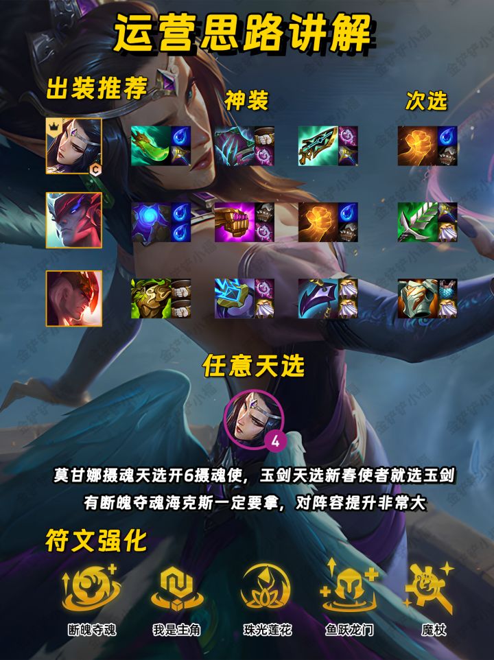 没玩过这个套路的兄弟姐妹赶紧试试🤣摄魂莫甘娜真的是恶心膈应的很🤢大范围伤害又能减攻击也就算了🙅♀放一个技能居然还能直接满血🩸✨过渡思路✨前期用强势天选凑羁绊过渡🚣♂猩红、决斗、天神等都可以✅八级钱根据来牌灵活选择打工棋子🃏有合适装备直接合尽量打连胜🥇4-2升八后直接梭哈找莫甘娜天选🧝♀然后就可以开始折磨对手了😛眼看着对手即将切掉你的莫甘娜😰一个技能瞬间回满血❗让对手