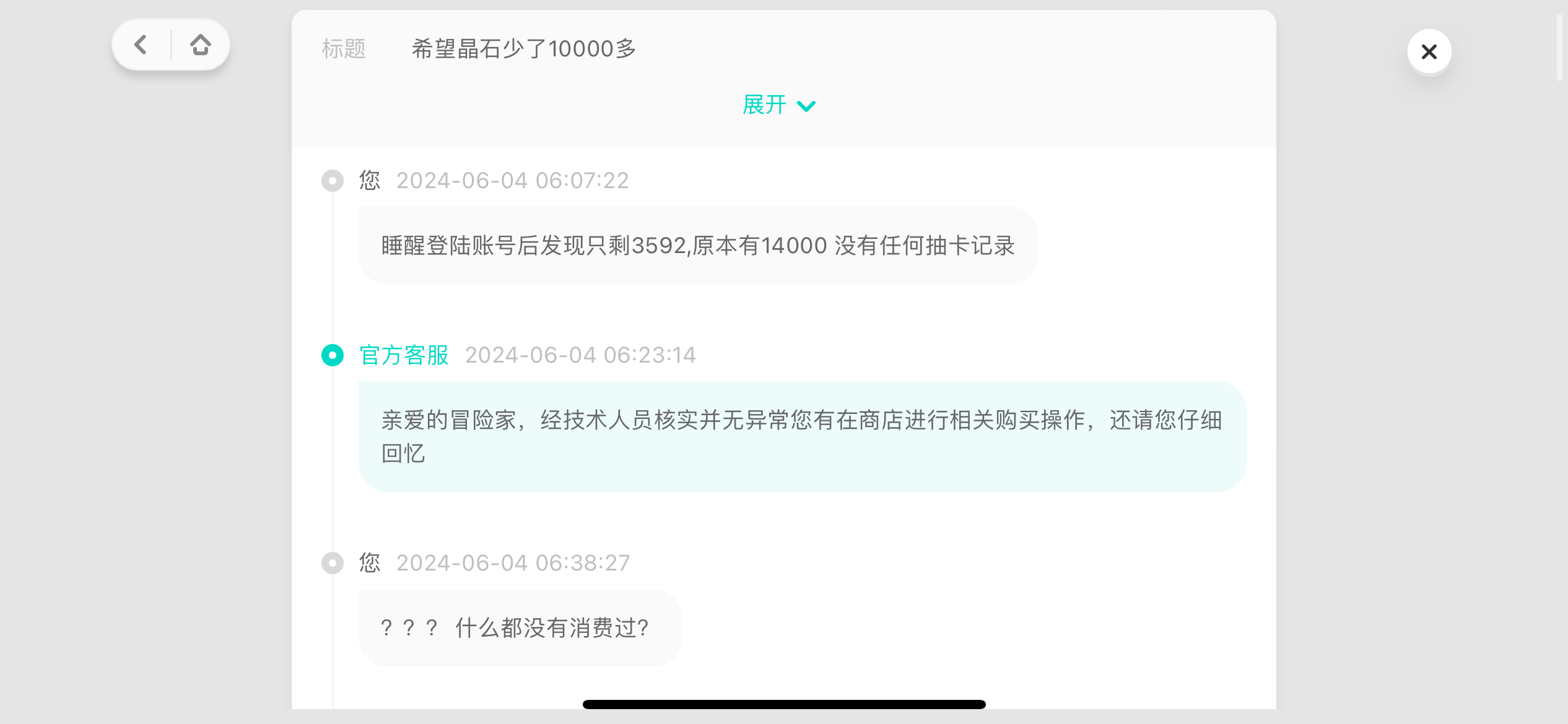 希望晶石莫名少了1w多,客服说我自己消费了叫我回忆, 多次声明我没有消费,并且我非常清楚的回忆了,我让客服提供我自己的账号消费说数据提供不了,涉及隐私,那你凭什么说我消费了? 我买啥了,强制克扣玩家晶石,客服回复永远一句话 仔细回忆, 你要我回忆什么, 回忆什么我从来没做的事情? 强迫我承认?? 吃相这么难看? #铃兰之剑