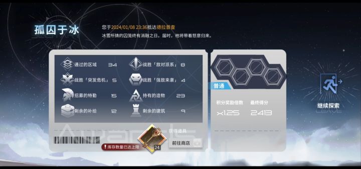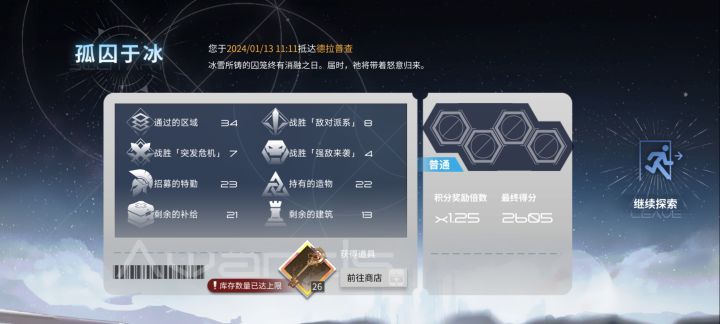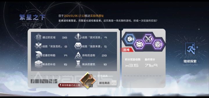 如图所示结算界面的统计会包含初始资源(特勤、造物、补给),但计算最终得分时会扣除初始资源再进行计算3.15难度分数计算:先算出普通难度下的总分,再直接×3.15并四舍五入改版后暂时还没遇到二三结局,不知道会不会有隐藏加分。补充:三结局分数比前面的强敌来袭少120分,即100分二结局孤囚于冰分数比普通的强敌来袭多40分,即260分。而且选择困难难度无法进入该结局!!#银河境界线#银河境界线攻略