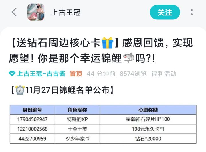 周周寻找“锦鲤”祝福你好运享不停,快来参与吧!你将是那位“幸运儿”活动时间:即日-12月17日19点59分活动内容:在本帖下方评论即可参与抽奖活动,抽出1位幸运儿送上锦鲤福利。回复格式:在评论中加入“任意祝福+我要抽锦鲤”。 例如,“祝周周活动顺利,我要抽锦鲤”。活动奖励:锦鲤礼包×① 内有:元宝*1000、凤凰1天*3、金条*10、圣诞狂欢(圣诞节特制时装)【活动规则】1. 敬请玩