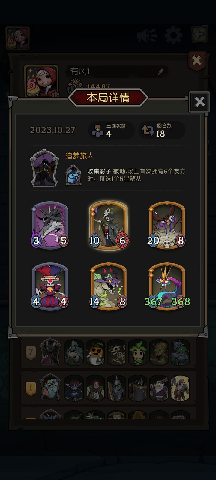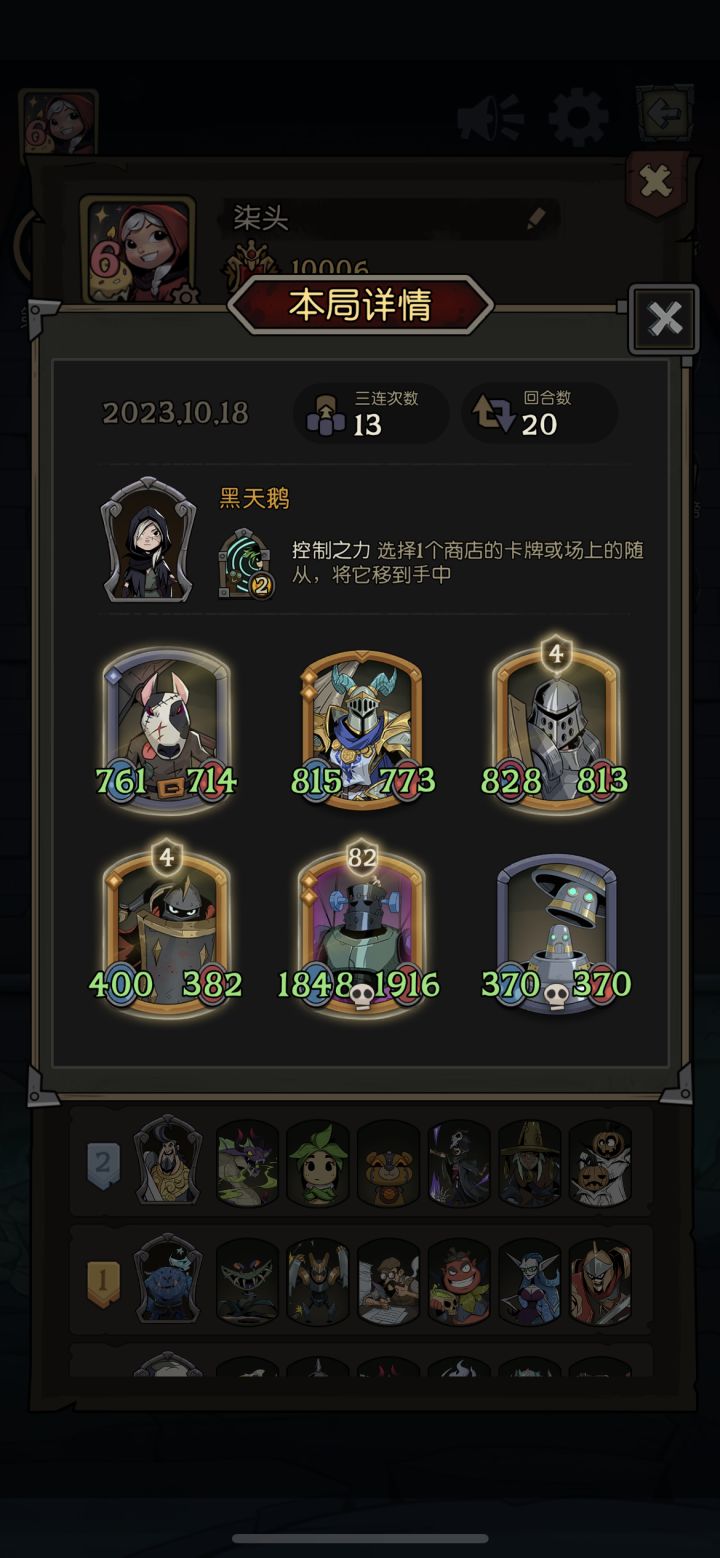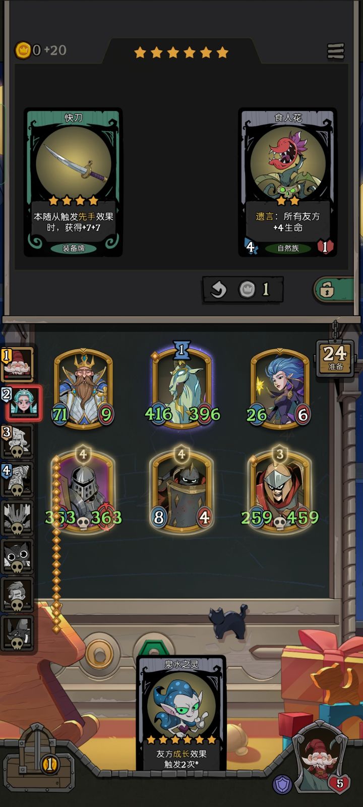 本来想玩自然养玫瑰骑士,可是这牌我把钱花光了都没来。然后碰到了这个叠盾放遗言的,真的很恶心,那次没打过。然后刷到了遗言横扫的龙,这种情况下这3星牌不比6星强100倍?于是调整站位,把其他成长牌都卖了只留大哥,顺便买个刺客看能不能嫖掉一两个盾。决战如图,刺客a出了一下,尽力了。然后就是小树苗大杀特杀时间,硬吃下了遗言然后和战士同归于尽了。对面也许松了一口气,但是我裤裆藏了3只幽灵👻,嘿嘿嘿,拿下#镜中对决