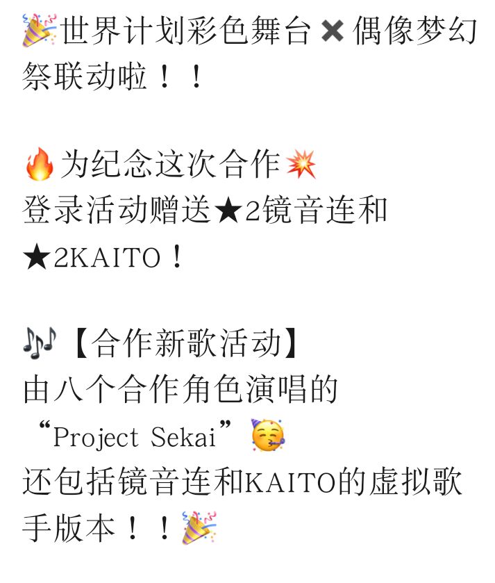 联动确认!!🎉世界计划彩色舞台✖偶像梦幻祭联动啦!!🔥为纪念这次合作💥登录活动赠送★2镜音连和★2KAITO!🎶【合作新歌活动】由八个合作角色演唱的“Project Sekai”🥳还包括镜音连和KAITO的虚拟歌手版本!!🎉#今天游戏圈发生了啥 #世界计划缤纷舞台 #偶像梦幻祭 #游戏杂谈 #镜音双子