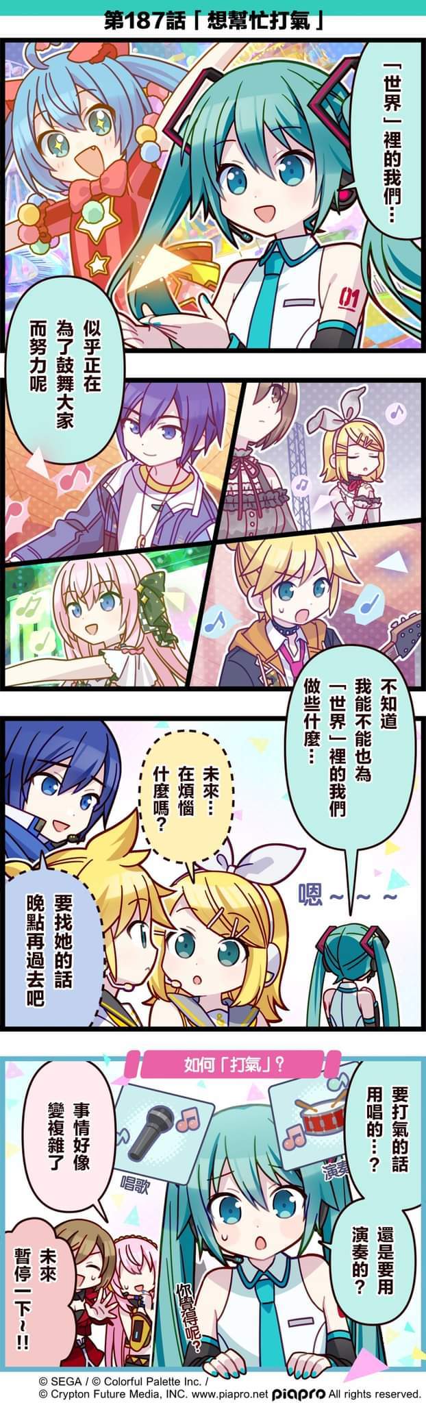 【「世界」劇場 四格漫畫】 尊敬的各位居民:今天是關於初音未來、鏡音鈴、鏡音連、巡音流歌、MEIKO和KAITO的小故事~第187話「想幫忙打氣!」🎤🥁 #PJSK #世界计划 #初音未来 #镜音铃 #镜音连 #巡音流歌 #MEIKO #KAITO