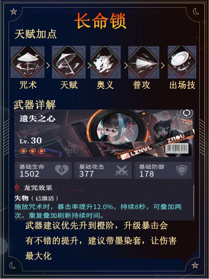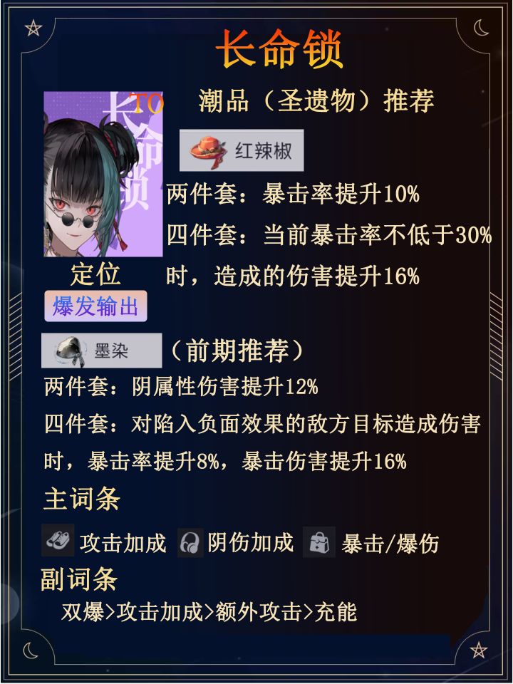 【配队】长命锁+尘嚣+语冰长命锁可以完美吃完语冰的充能,在尘嚣破条之后,打出语冰咒术上增益→长命锁双咒术+大招爆发→语冰开大→长命锁第二个大招→尘嚣继续破条【潮品(圣遗物)推荐】红辣椒两件套:暴击率提升10%四件套:当前暴击率不低于30%时,造成的伤害提升16%墨染两件套:阴属性伤害提升12%四件套:对陷入负面效果的敌方目标造成伤害时,暴击率提升8%,暴击伤害提升16%