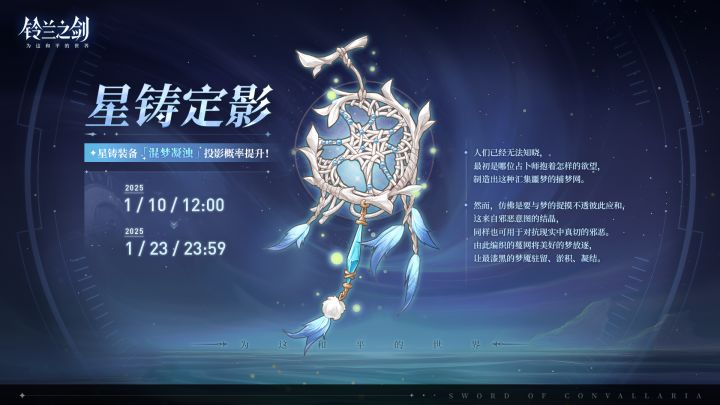 亲爱的团长:「星铸定影」限时投影将于 2025/01/10 12:00 - 2025/01/23 23:59 开启,全新星铸装备「混梦凝浊」投影获取概率将大幅提升!✦ 此投影属于「定影」,与同类型投影的保底机制共享。 ✦ 活动中,传说装备的单次投影几率为5%,当期星铸装备占传说装备几率的75%。若本次获得的传说装备不是当期星铸装备,则下次获得的传说装备必定是当期星铸装备。✦ 每投影1次,累