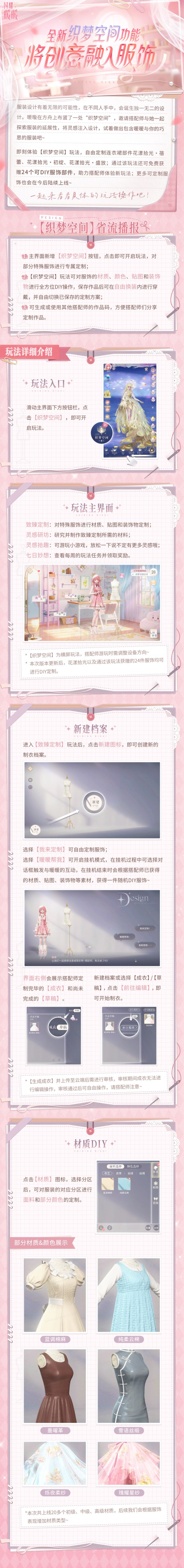 服装设计有着无限的可能性,在不同人手中,会诞生独一无二的设计。⭐8月2日更新后,全新【织梦空间】玩法上线,将灵感注入设计,试着做出包含暖暖与你的巧思的衣装吧~#闪暖功能优化速报 ⭐玩法省流播报①主界面新增【织梦空间】按钮,点击即可开启玩法,对部分特殊服饰进行专属定制;②【织梦空间】玩法可对服饰的材质、颜色、贴图和装饰物进行全方位DIY操作,保存作品后可在自由换装内进行穿戴,并自由切换已保
