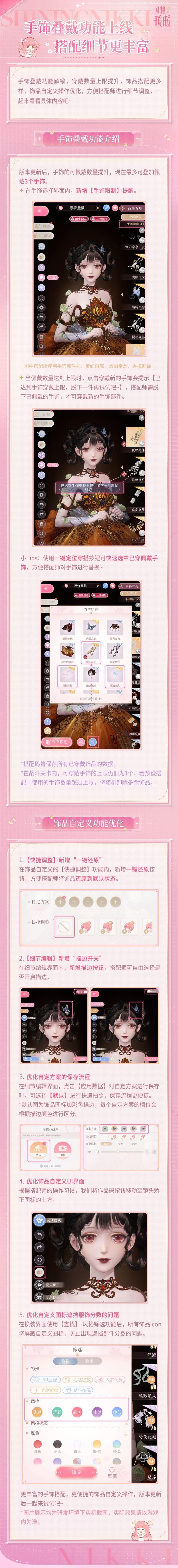 5月22日更新后,手饰叠戴功能解锁,穿戴数量上限提升,饰品搭配更多样;可自定义饰品数量增加,本次新增140+【发饰】【帽子】【胸饰】部件支持自定义;饰品自定义操作优化,细节调整更便捷~#闪暖功能优化速报 ⭐手饰叠戴功能省流播报手饰的可佩戴数量提升,现在最多可叠加佩戴3个手饰。⭐饰品自定义操作优化省流播报①【快捷调整】新增“一键还原”;②【细节编辑】新增“描边开关”;③优化自定方案的保