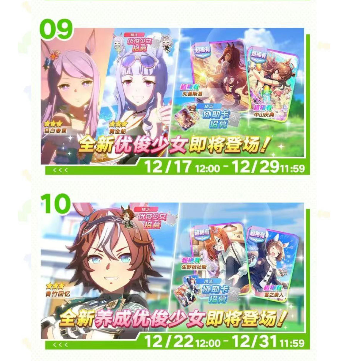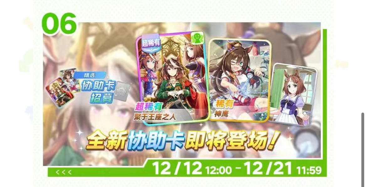 12.12更新的女帝力卡,直接pass12.12更新的黄金城市智卡,直接pass12.17更新的丸善斯基速卡,在当前日服环境下排名约No21,比SSR北破领先1个名次,考虑到卡面,我个人就入手了。12.17更新的中山庆典智卡,在当前日服环境下排名约No17,超SSR美妙姿势和优秀素质7个名次。12.22更新的雪之美人智卡,在当前日服环境下排名约No42,可以放弃12.22更新的生野狄杜斯