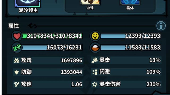 【困难】作为第一批通关的老玩家,当时凭着免伤直接乱杀,如今免伤基本退出舞台,新玩家光靠堆吸血或堆防御又站不住,急需寻找一种相对容易达成的通关途径。【实践】本人亲手实验了高伤害吸血流火战,发现依然站不住。结合群友描述,堆防御生命的路线,也很难站住。【最终选择】闪避霸体流(如下)无需多好的装备,重点在于闪避破100%,其实应该是越高越好,因为对面会有命中,所以即便如上图数据也会破防,这时候就