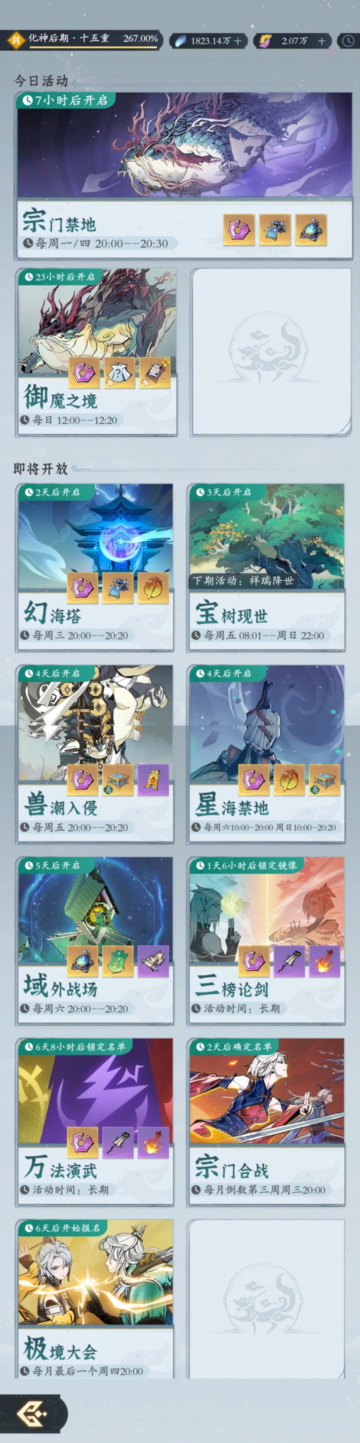 以下挂机攻略只适用于佛系玩家或佛系宗门,以及临时参加不了活动的玩家,本人不作提倡!副本活动是轮替着来的,大部分都是晚上8点开始。大佬们想拿奖励但又想偷懒的话,可以开个云手机挂着,到点进去点一下就可挂机了(有些副本需要手动点一下参加),我按照下面两个分类供玩家参考!一、可挂机御魔之境:每天中午12点开始,可挂机,抽奖需要手动才有。宗门禁地:宗门成员打自己宗门的12个妖兽。幻海塔:打怪爬塔,