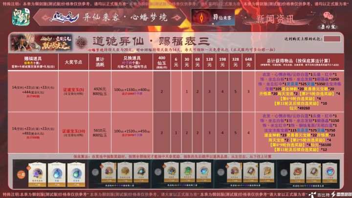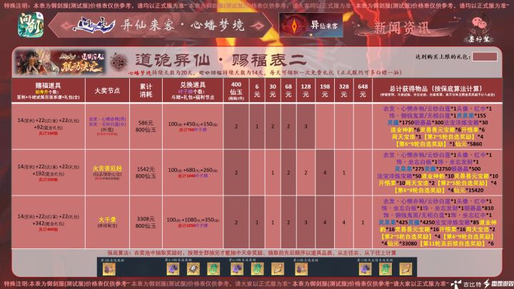 #问剑长生 #问剑长生活动攻略 #问剑长生史官 大家好,今日御剑服新活动正式全部悉知,为大家带来问剑长生最新活动,预计正式服将在四月中下旬前后上线的“道诡异仙”联动活动!以上是各节点价格表,所需的物资可以参考攻略图哦~注:本攻略所有价格均用最省钱方式(即免费抽奖次数拿完)计算。内测数据,仅供参考~