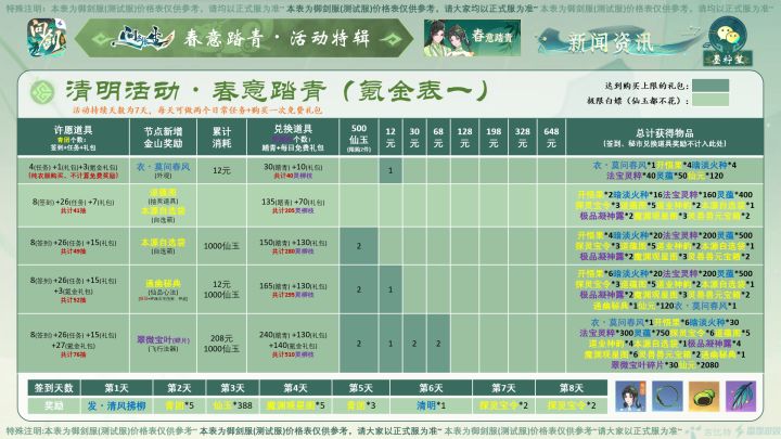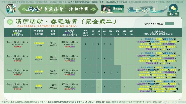 #问剑长生 #问剑长生活动攻略 #问剑长生史官 大家好,今日御剑服新活动正式全部开放,为大家带来问剑长生预计清明节前后在公测服上线的“春意踏青”活动,以下是各节点价格表,所需物资请参考攻略图。注:本攻略所有价格均用最省钱方式(即免费抽奖次数拿完)计算,并为内测数据,仅供参考