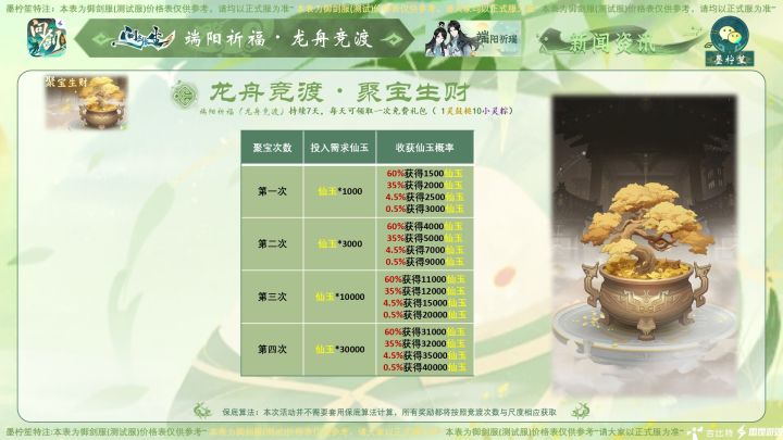 #问剑长生 #问剑长生活动攻略 #问剑长生史官 大家好,今日新活动的数据已经统计完毕喽,为大家带来问剑长生最新活动,预计正式服将在端午节前后上线的“端阳祈福”活动!以上是各节点价格表,所需的物资可以参考攻略图哦~注:本攻略所有价格均用最省钱方式(即免费抽奖次数拿完)计算。内测数据,仅供参考~