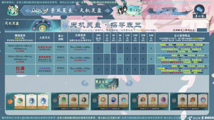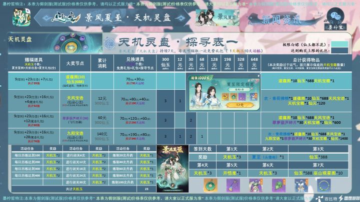 #问剑长生 #问剑长生活动攻略 #问剑长生史官 大家好,今日新活动的数据已经统计完毕喽,为大家带来问剑长生最新活动,预计正式服将在夏至前后上线的“景风夏至”活动!以上是各节点价格表,所需的物资可以参考攻略图哦~注:本攻略所有价格均用最省钱方式(即免费抽奖次数拿完)计算。内测数据,仅供参考~