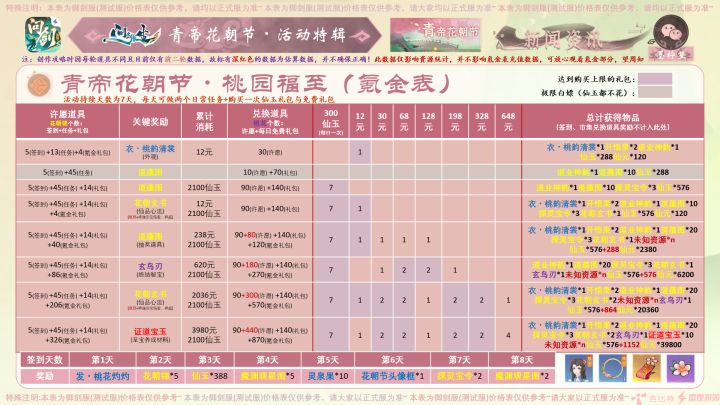 #问剑长生 #问剑长生活动攻略 #问剑长生史官 大家好,今日御剑服新活动正式全部开放,为大家带来问剑长生预计3月在公测服上线的“青帝花朝节”活动,以下是各节点价格表,所需物资请参考攻略图。以下是各节点一览:衣・桃韵清裳(蓝衣)12元第一轮(道蕴图)白嫖第二轮 (花朝玄书)12元第三轮(道韵图)12元第四轮(玄鸟刃)620元第五轮(花朝玄书)2036元第六轮(证道宝玉)3980元注