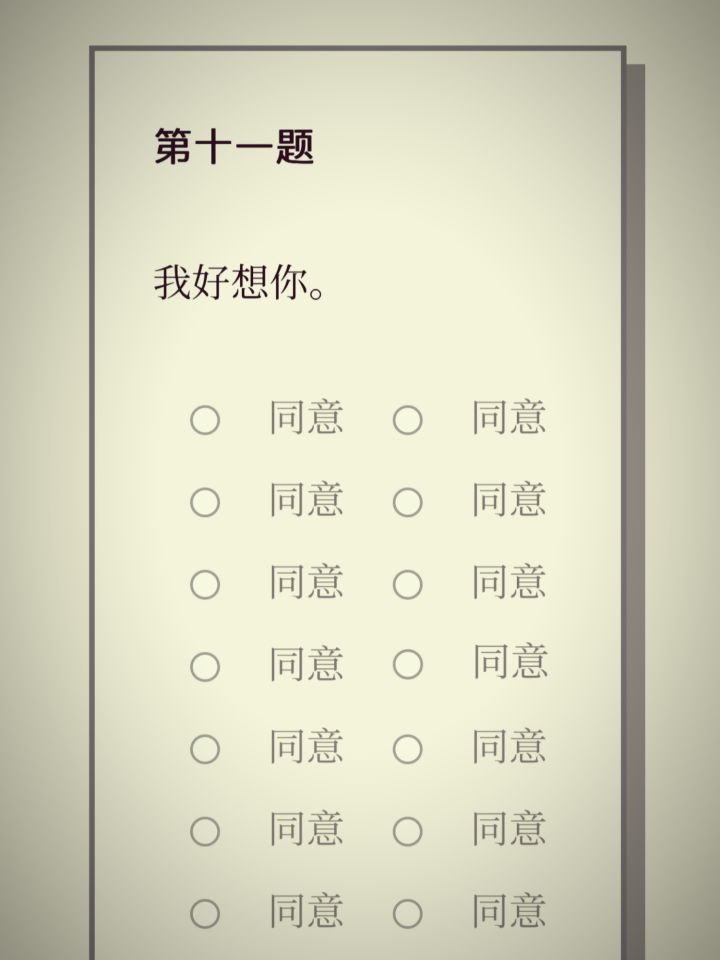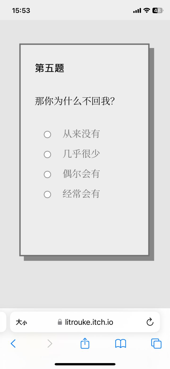 游戏:Please Answer Carefully平台:itch.io(网页就能做) 📄一份五分钟左右的调查问卷,给你带来背后发寒的极致体验。 看似常规的提问,突兀响起的敲窗声,一闪而过的诛心之语,步步紧逼的问题,违心的回答,让这份问卷仿佛藏了一个病娇的灵魂,好像下一秒就要顺着网线过来抓我了似的。 没有跳脸,没有恐怖画面,单凭一份问卷就能营造出一种反胃的恐怖氛围,后劲还很大,属于非常有意