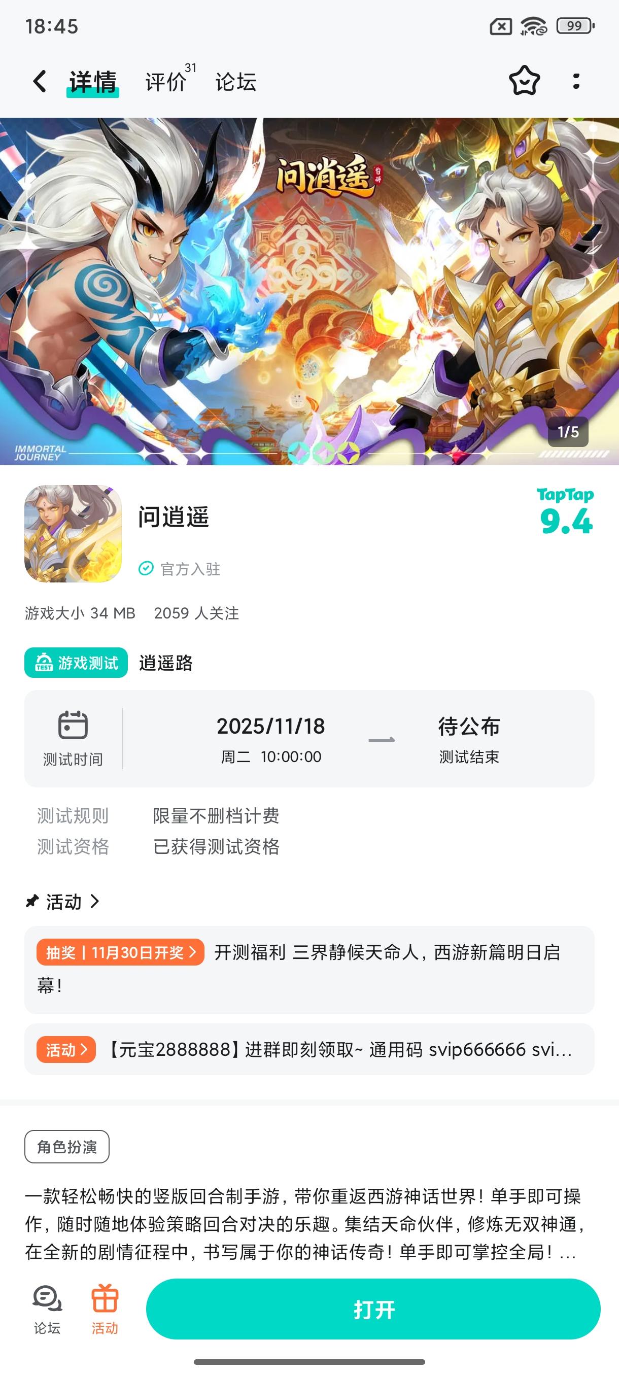 🏳🌈游戏类型:角色扮演、回合制、竖版、策略、养成、休闲、西游✨测试类型:限量删档(资格有限,先到先得)🌤招募时间:2026/01/03~2026/01/08🌋测试平台:安卓🚤测试资格领取方式:点击帖子评论区上方的游戏链接【预约】,然后点击“游戏头像”进入游戏详情页,最后点击底部导航栏【参与测试】即可完成招募。💛感兴趣的小伙伴赶紧先行预约并报名参与测试吧!具体测试资格通知可留意TapTa