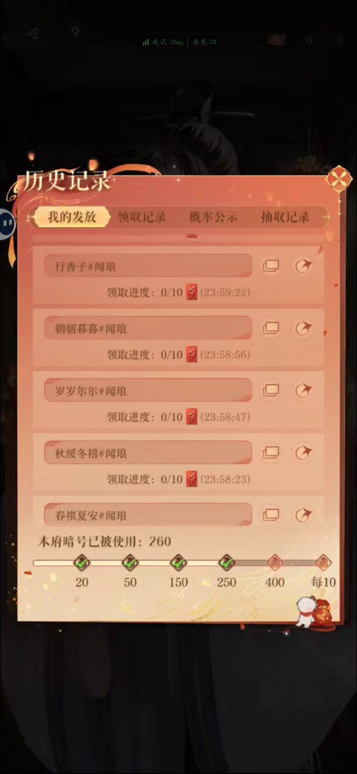 春祺夏安#闻琅秋绥冬禧#闻琅行香子#闻琅如梦令#闻琅花非花#闻琅雾非雾#闻琅山亭宴#闻琅明月棹孤舟#闻琅朝朝暮暮#闻琅岁岁尔尔#闻琅 红包个十个,一共一百,领完接着发#如鸢 #如鸢兑换码