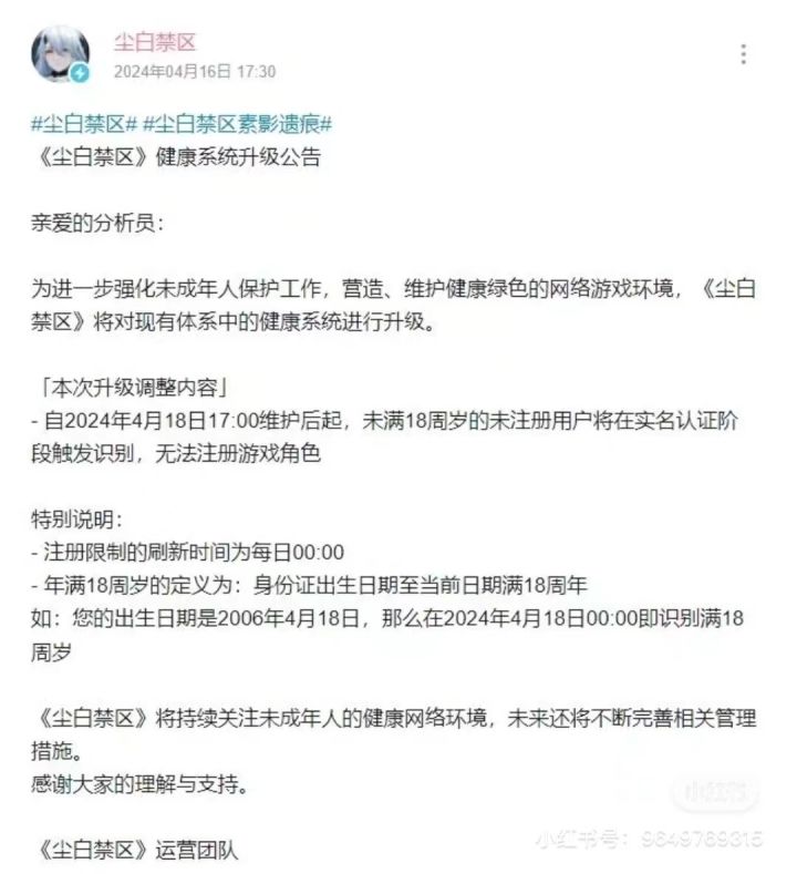 自2024年4月18日17:00维护后起,未满18周岁的未注册用户将在实名认证阶段触发识別,无法注册游戏角色。好家伙,这下不是周末才能玩了,这下是没满十八彻底玩不了了#今天游戏圈发生了啥 #尘白禁区 #防沉迷 #游戏资讯