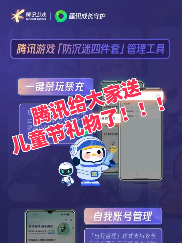 各位小伙伴们,腾讯给大家送儿童节礼物来了!🎉为了更好地帮助家长管理孩子的游戏行为,腾讯游戏宣布将升级“防沉迷四件套”管理工具,让管理更加个性化、便捷化。此功能将于5月29日发布,儿童节就可以正式实装了,那现在就让我们一起来看看吧!📱💪新功能介绍这次升级主要涵盖四个方面,包括“一键禁玩禁充”、“自我账号管理”、“绿色手机上报”和“一键屏蔽陌生人”。这些功能从游戏时长、消费、社交等多个维度,帮助家