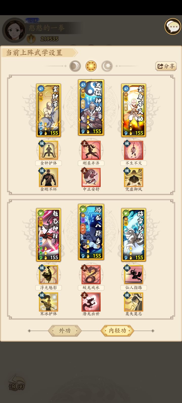 目前门派等锦衣卫开,抽了一套太极体系。想玩下先、后手套路。自配这套阵容目前被打爆了,感觉跟谁都是37开(我3),又不想不放弃。求大佬指点~#阳拳#无名江湖