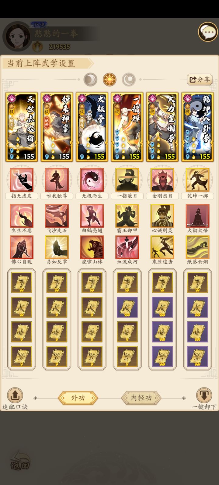 大家好,我是秋白,一个喜欢玩拳系的拳修玩家。以下攻略包含阴拳和阳拳部分,后期带风魔的配招前期没开铜人门没拿到风魔的萌新朋友请不要使用,会造成适得其反的效果,有需要帮助的大佬,可以点击我的头像打开主页看更多攻略或者主页添加我的好友。接 调号 爬塔 禁地 氪金养号规划有需要的联系我1.关于拳修玩家门派开招式和武学的优先级选择.2.关于阴拳从入门到入土3.关于阳拳的前期配招4.关于阳拳的后期
