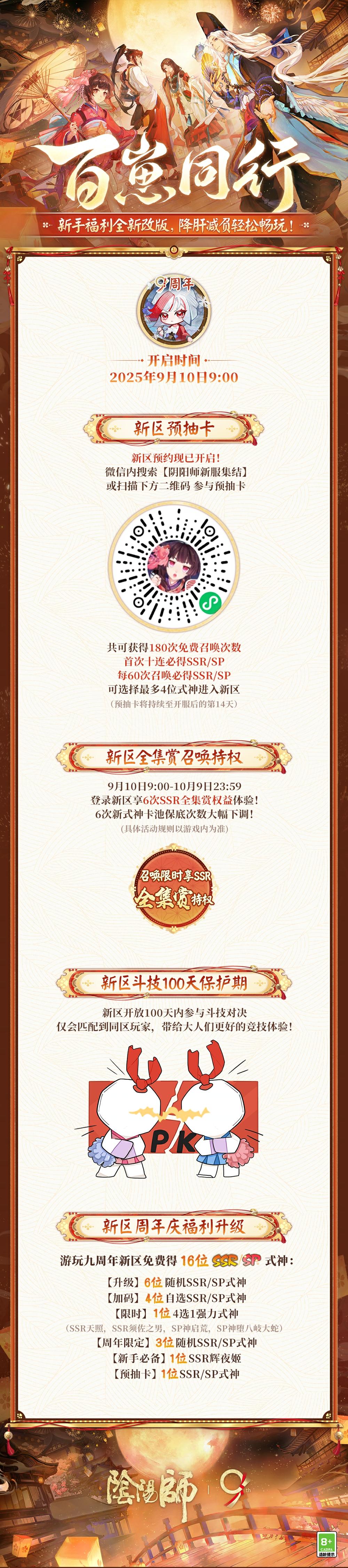 九载同行织就命运羁绊,相伴故事凝成时光琥珀。周年庆典即将启幕,九周年庆特别新区【百崽同行】现已开启预约集结,并将于9月10日9:00正式开服! ※周年新手福利加码,99名式神限时免费送! ※新区集结期间预抽卡,最多可获得180次免费召唤次数! ※全新成长任务,免费领取5名SSR/SP式神,解锁阶段任务获取丰厚成长道具! ※全新缘初召唤,30天内每日免费1抽,新手召唤特权可额外获取随机SSR/SP