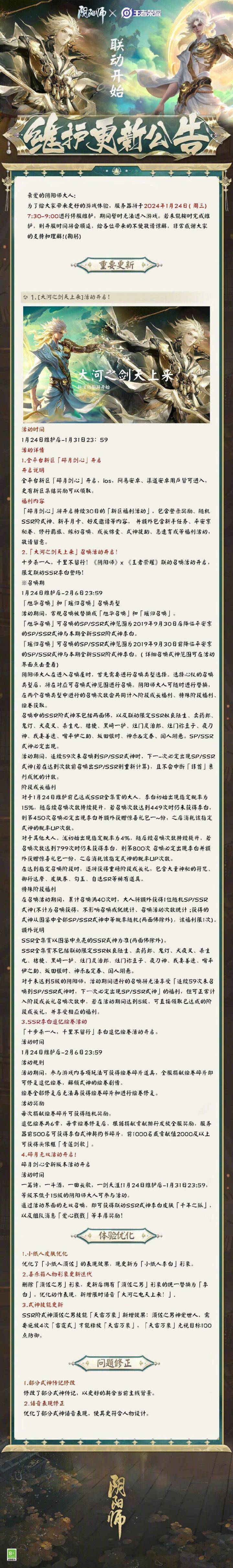 1.全平台新区「碎月剑心」开启集结※集结时间1月24日9:00-2月7日7:002.「将近酒」召唤活动限时开启!哈哈哈哈,大河之剑天上来!《阴阳师》x 《王者荣耀》联动召唤活动开启,限定联动SSR李白登场!※活动时间2月7日维护后-2月21日23:59#阴阳师#阴阳师活动#阴阳师手游#阴阳师新区预约