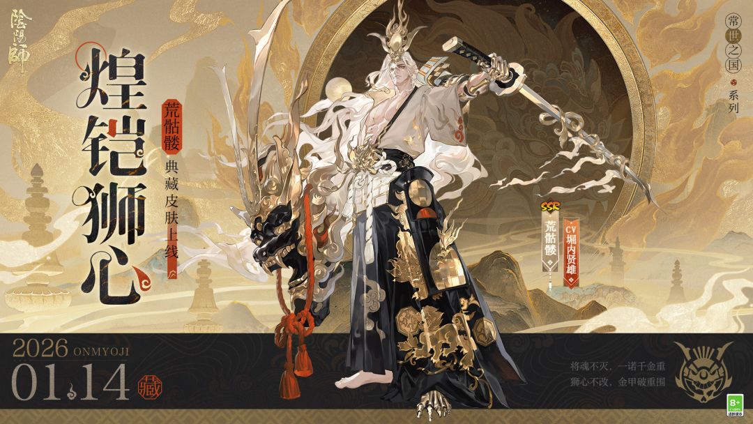 窥见狮瞳深处燃烧的炙火,与他心中的信念共鸣回响。 狮魂淬火化盾,锻金刚之躯,王狮之志于胸腔奔涌,永燃不灭。 「心守不动志,身铸金狮魂。」 △「常世之国」高级系列荒骷髅典藏皮肤「煌铠狮心」将于1月14日维护后上架皮肤商店,售价148魂玉,上架首周限时折扣118魂玉。 大人们戳视频即可查看皮肤专属语音及动态效果,更多皮肤情报,还请关注扫地工的后续报道~ #阴阳师常世之国高级系列 #荒骷髅典藏皮肤 #阴