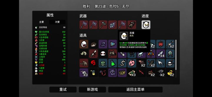 拿到红色斧头就质变,一波下来30多加伤,缺点是后期打下来收获一直扣,可能是我多拿了些减收获的道具。遗憾是打精英怪掉的两个红色道具都是对近战没用的卷轴和狼头盔,我拿了只是因为品质高。本人在这个游戏阅历较短有选择道具和武器上的错误还请口下留情。#Steam游戏#阵容分享#Steam#肉鸽