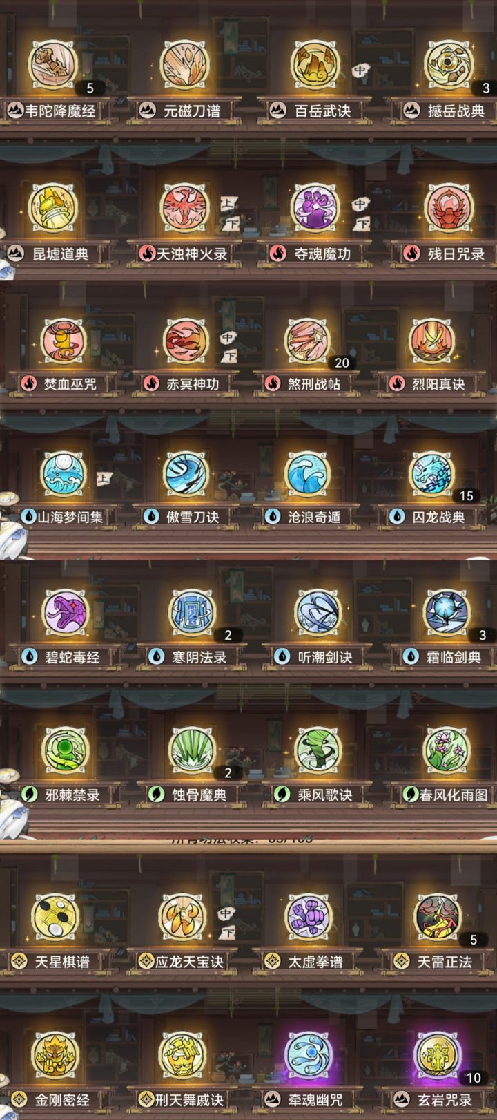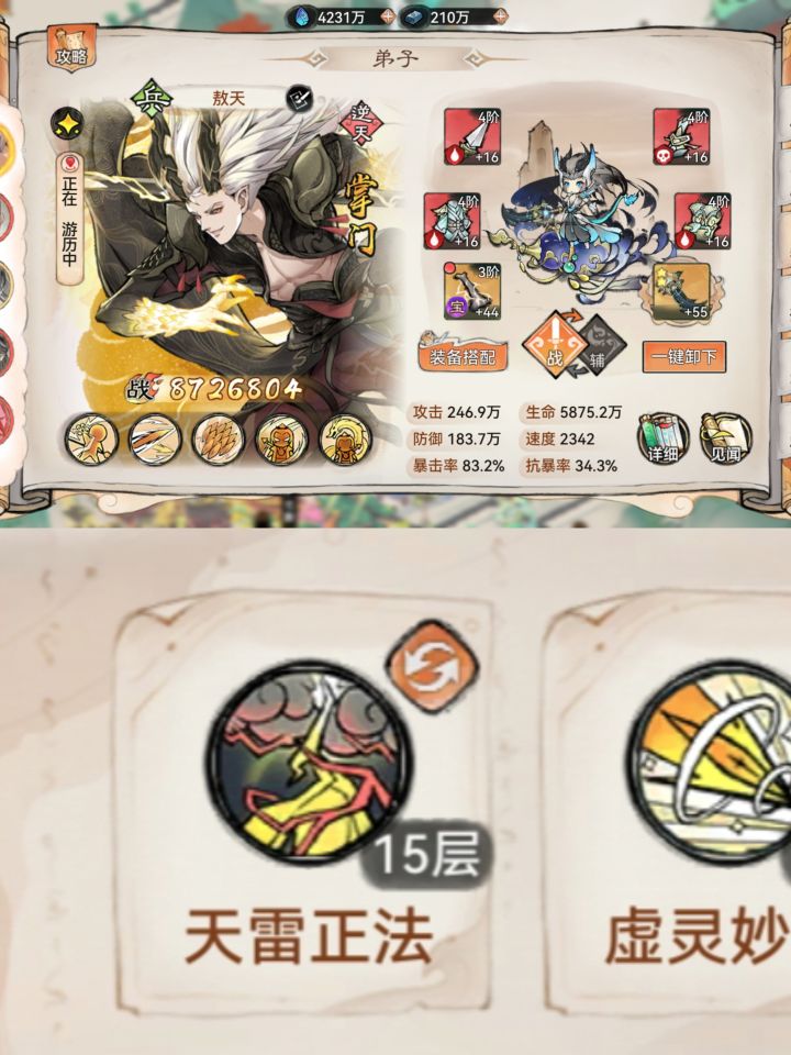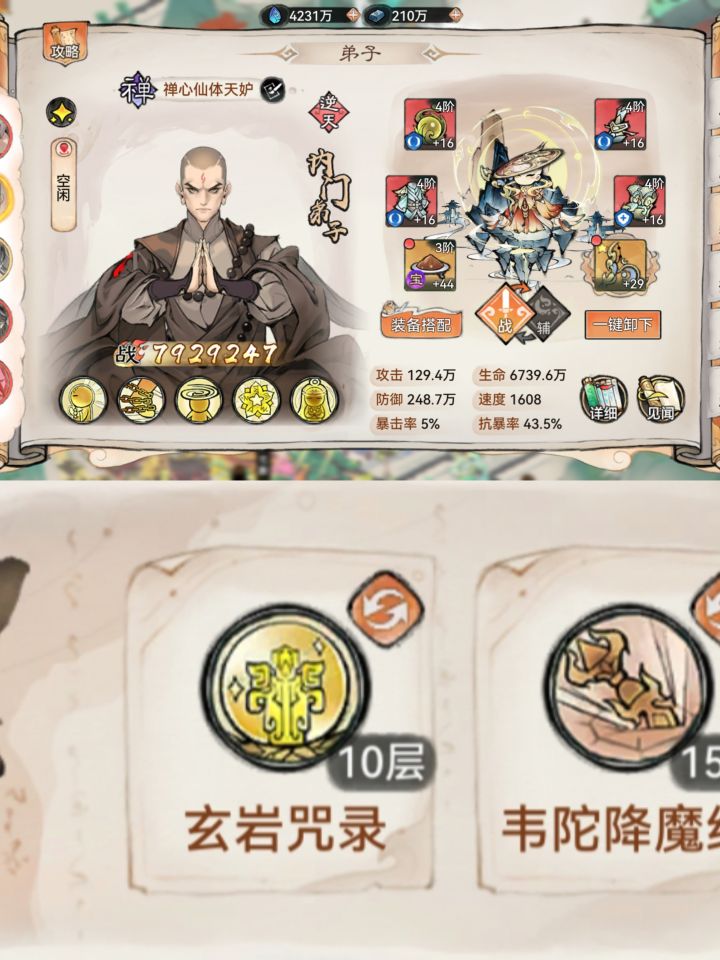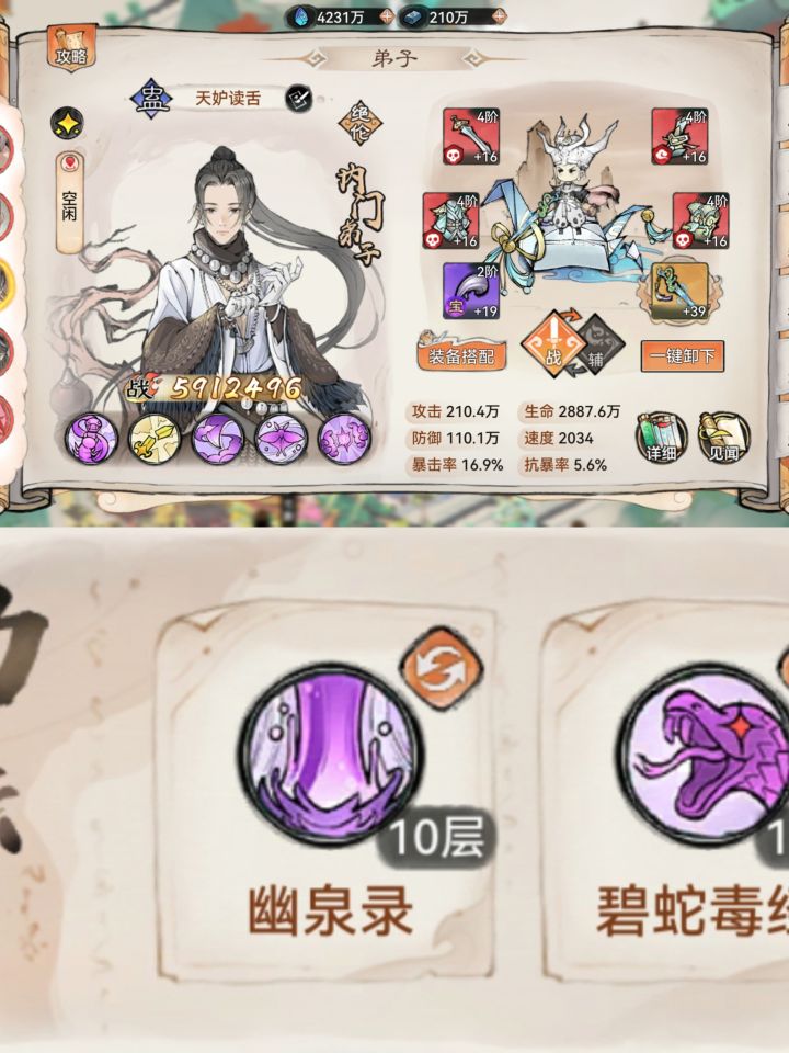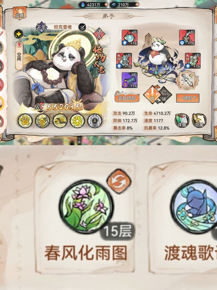 1.2w年3.3Kw,从萌新强撑到现在,实在不知如何玩了,求助一下!问题:1-阵容可以看到多余熊猫,蛊,主要凑合山海却没想到拉的比剑高只能阵容用!熊猫下了却不知道该用什么,纠结水兵和五禅!其他弟子不知哪该下换什么!2-功法装备搭配不伦不类,例:禅等3-法宝,法宝五行属性根据功法选择,但是禅我比较纠结,凤魂地藏?火土?三阶法宝水?功法也有水的!4-本命法宝就一点不懂,本命炼几阶又哪种品质可