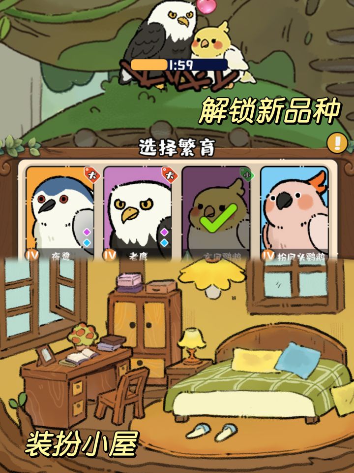 本次来介绍下繁育的细节,顺便给新入坑的鸟宝们介绍下: ——游戏名《雀食好玩》,小程序搜索就可以体验了! 繁育当然是先造鸟窝 首先收集5个树枝,派遣小鸟外出探险就可以收集树枝拉,然后就可以给小鸟配对繁育了; 繁育的小鸟外观会继承父/母的外观,特性品质也有概率继承,还有概率获得异色小鸟,极小概率获得天使鸟(天使鸟拥有双属性噢~) 想看看大家都繁育出什么小鸟呢?#雀食好玩 #发现好游戏 #小鸟 #鹦鹉