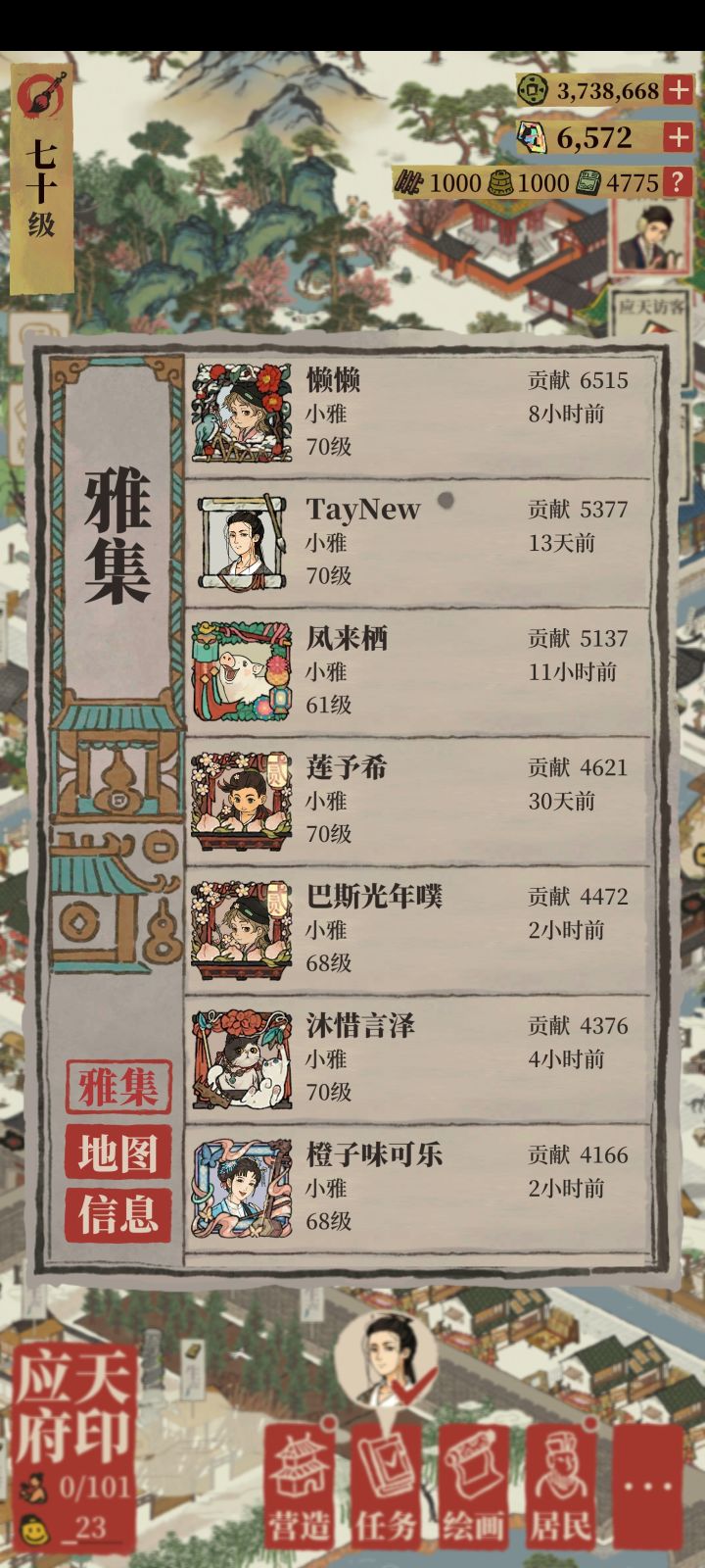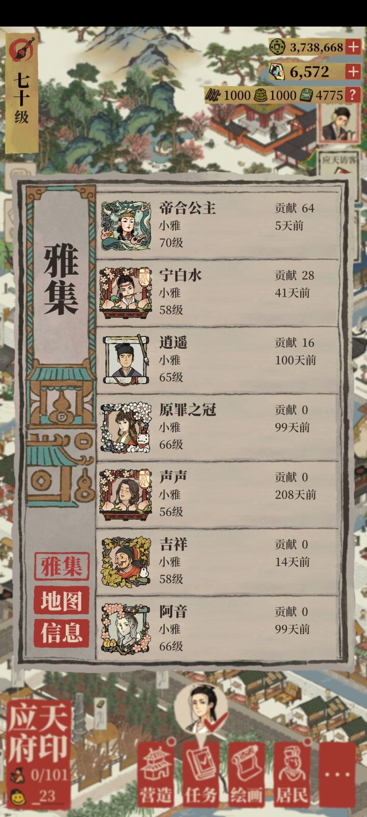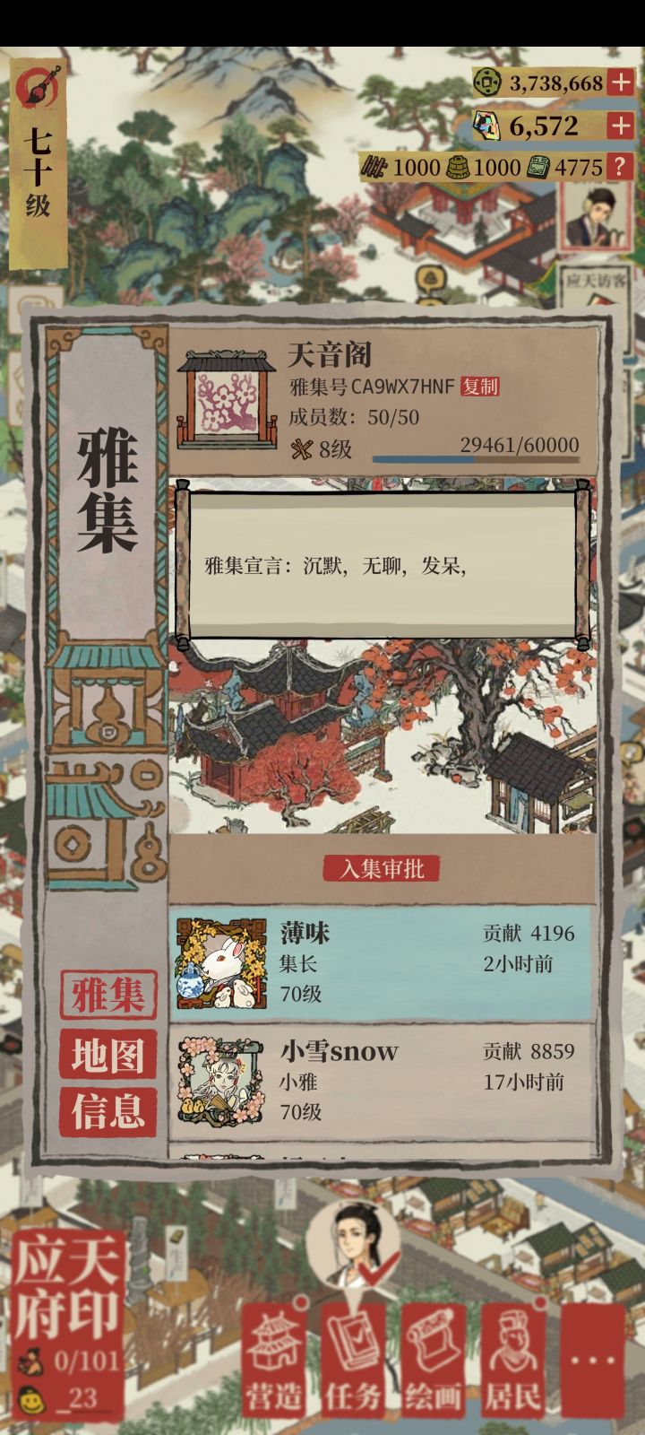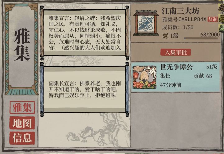 雅集:江南三大坊 号:CA9LLP84X。比较佛系,我属于玩一会不玩一会,所以我比较接受玩一会不玩一会的玩家,因为游戏嘛,娱乐至上,在我这不必整得像上班似的(因为我就是为了不被催自己开了,笑死,结果太乌托邦了没人来),虽然可能会没人来,没关系的,等我不心疼我的天石接受现实,或许也会解散,但是但凡来人了,我就一直守着#雅集