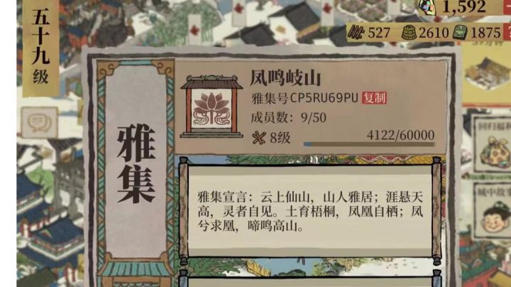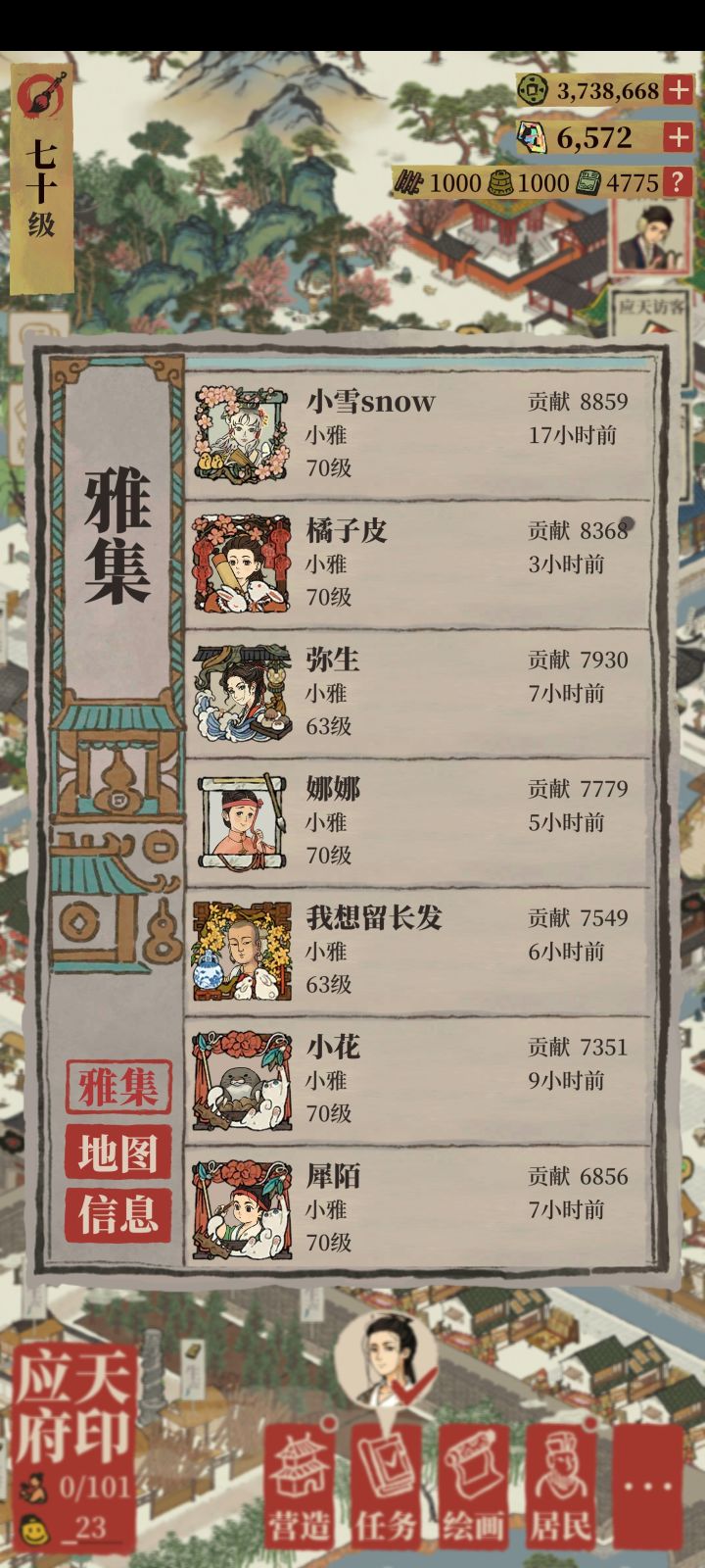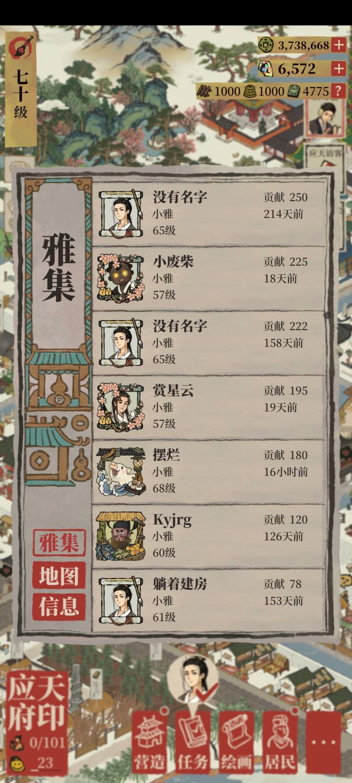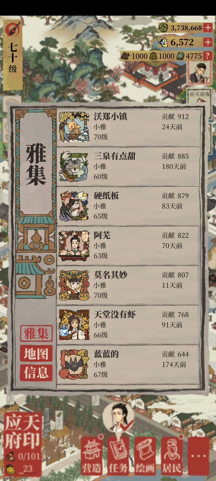 雅集:江南三大坊 号:CA9LLP84X。比较佛系,我属于玩一会不玩一会,所以我比较接受玩一会不玩一会的玩家,因为游戏嘛,娱乐至上,在我这不必整得像上班似的(因为我就是为了不被催自己开了,笑死,结果太乌托邦了没人来),虽然可能会没人来,没关系的,等我不心疼我的天石接受现实,或许也会解散,但是但凡来人了,我就一直守着#雅集